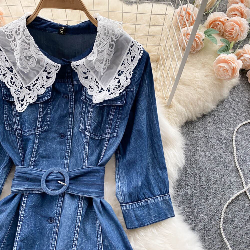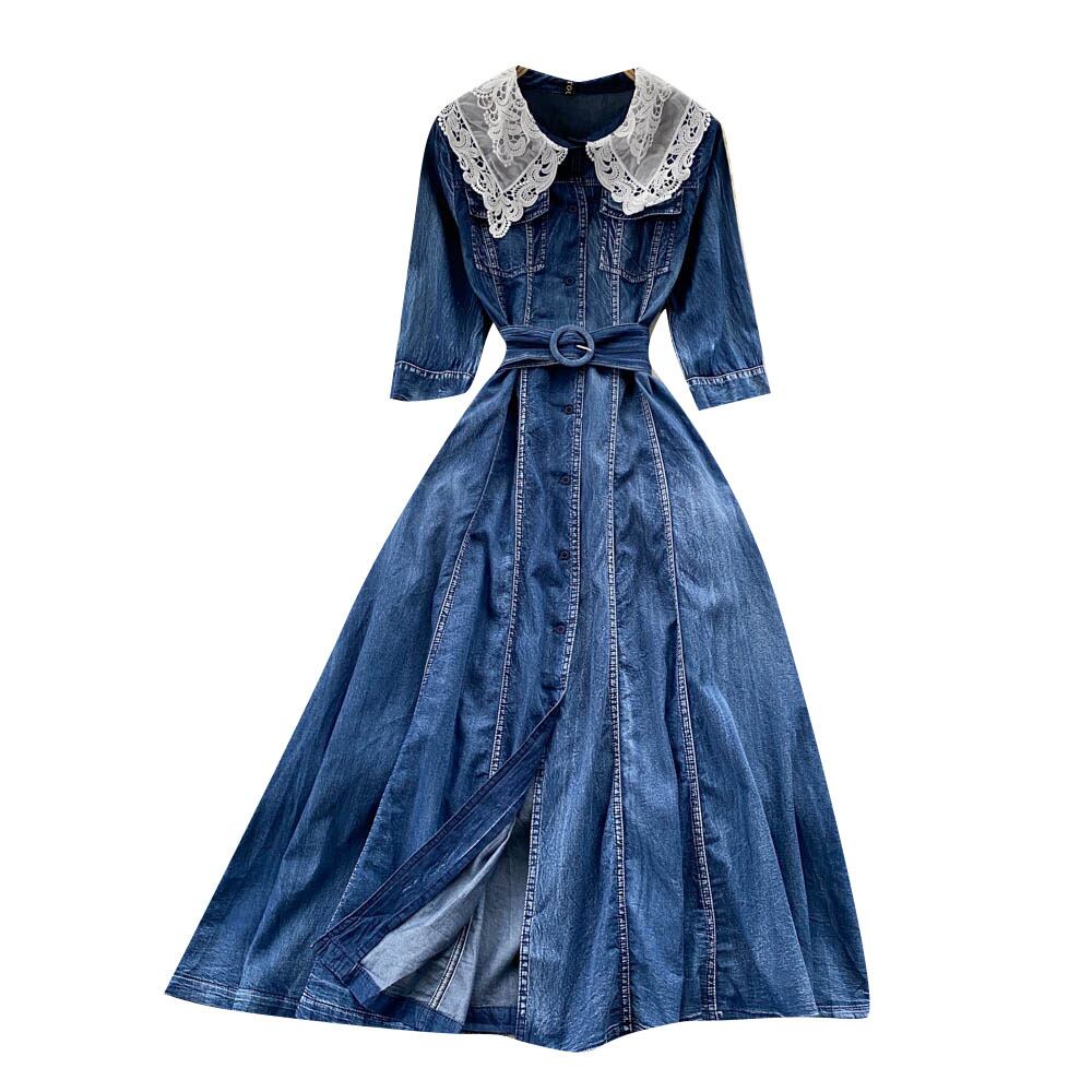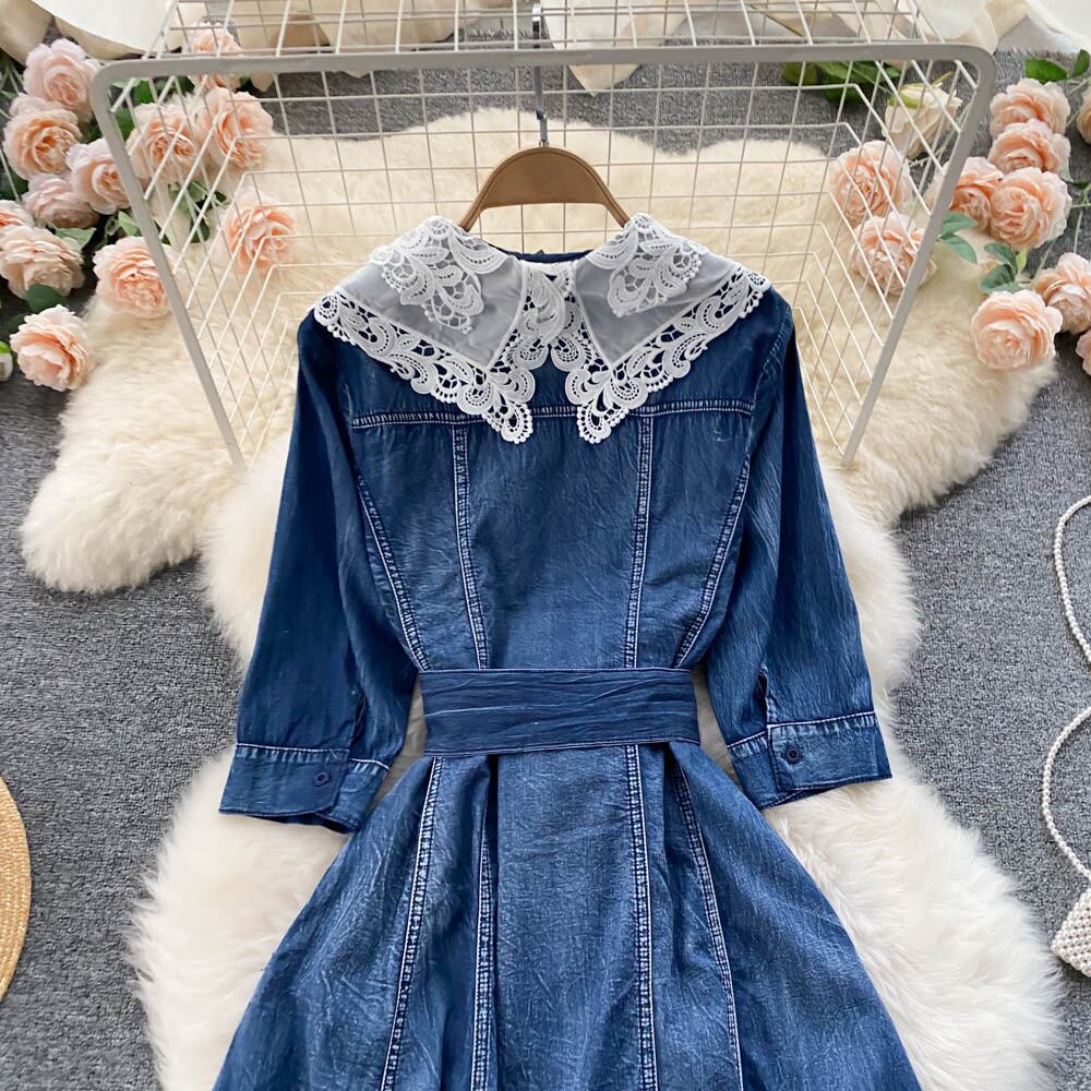 French Waist Dress Lace Stitching Sensation Niche Celebrity Temperament Three-quarter Sleeves Buttoned Denim Shirt Dress レース ステッチ lyxaj22399372542