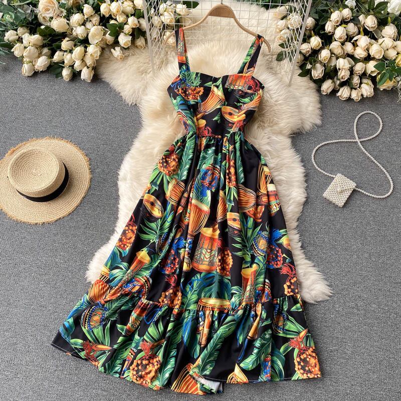 2021 retro fashion print suspender skirt seaside holiday lotus leaf waist waist slim big swing beach dress women レトロ ビーチ スカート スリム lyxaj27939698160