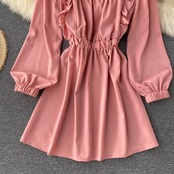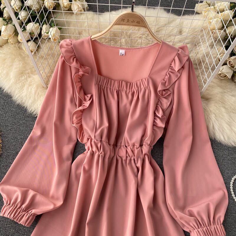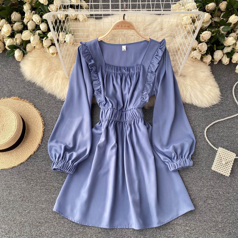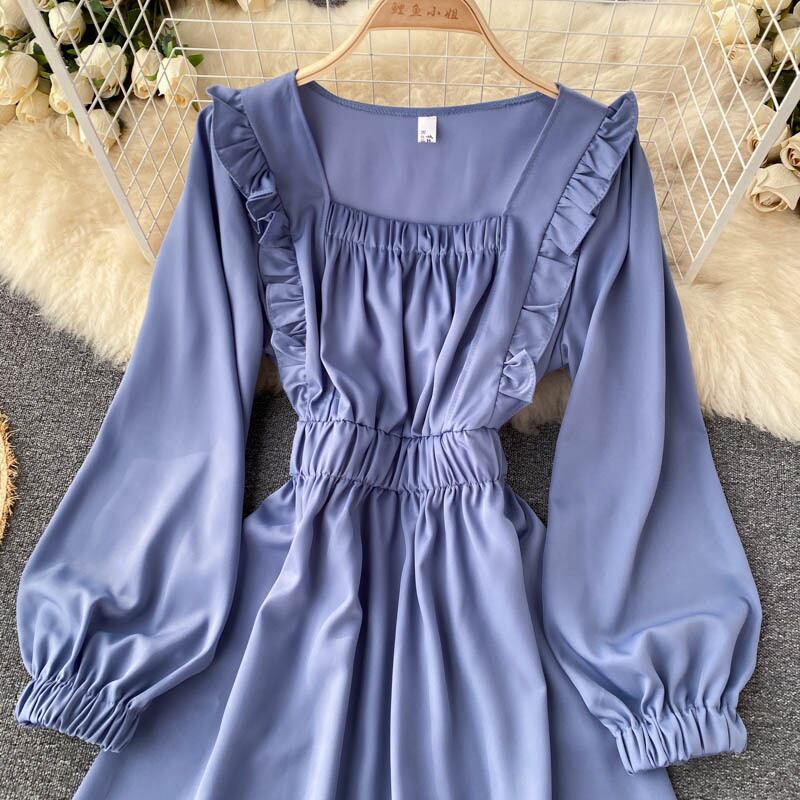 2021 autumn new ruffled French long-sleeved square-neck waist dress temperament is thin A-line skirt small ロング オータム 秋物 スカート Aライン スクウェア lyxaj65454215422