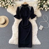Hepburn style French dress slim fit, off-the-shoulder drill strip stitching puff sleeves, high-end celebrity temperament package hip skirt スカート スリム ステッチ lyxaj78563622362