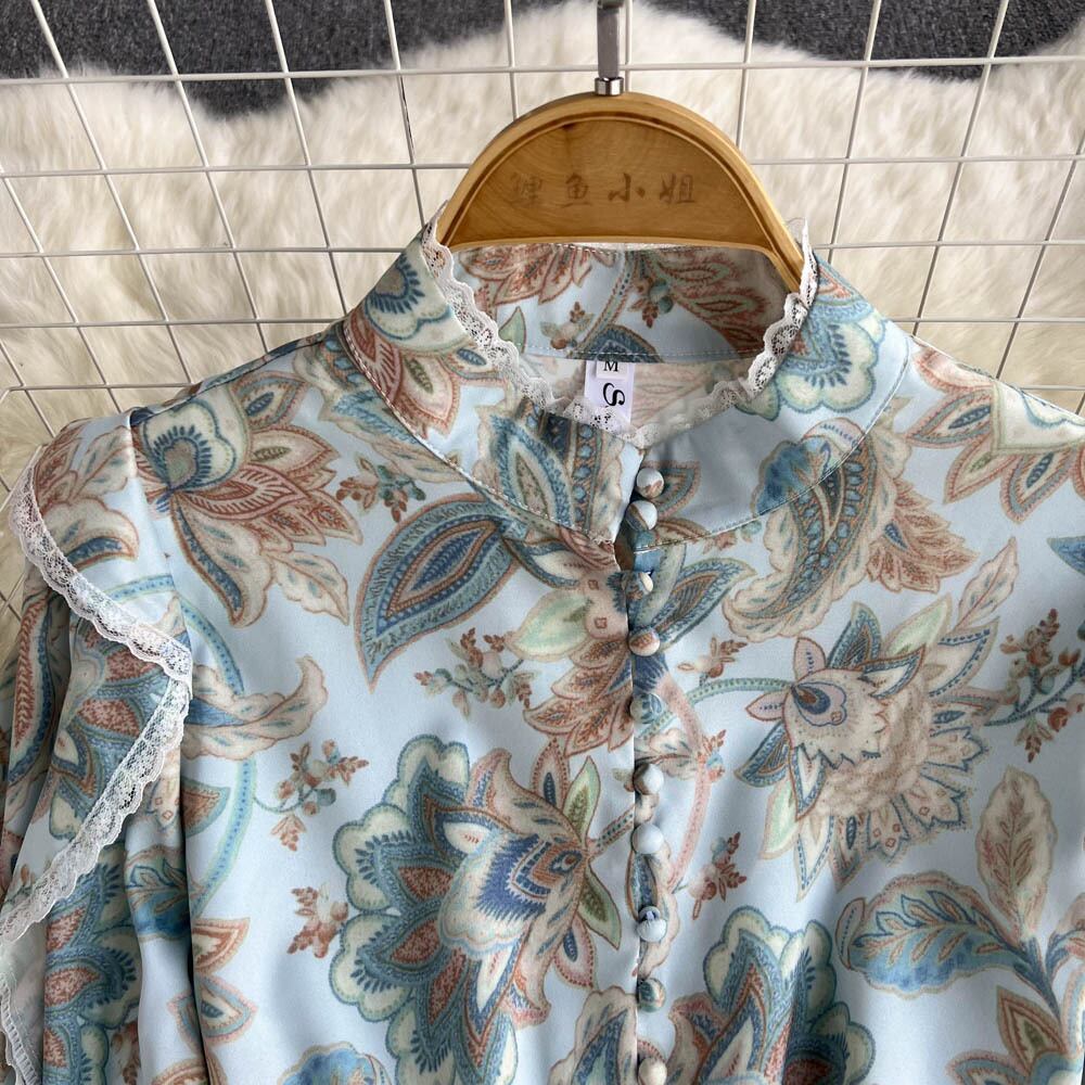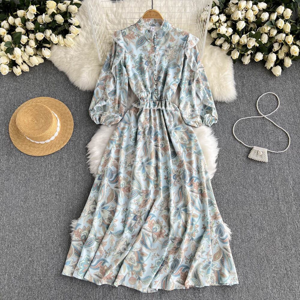 Celebrity temperament stand-up collar court retro print dress waist slim ruffled long-sleeved elegant high-end dress ロング レトロ エレガント スリム lyxaj69207657050