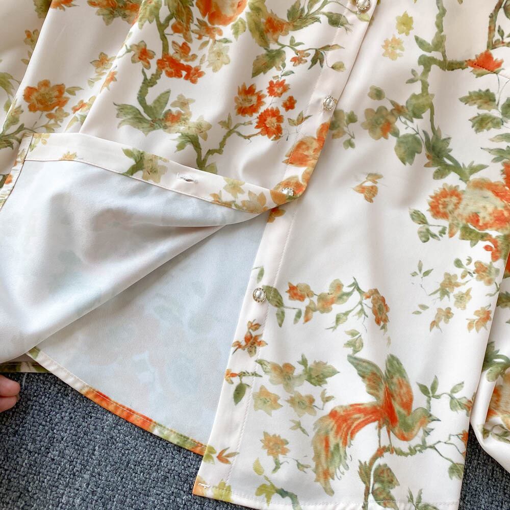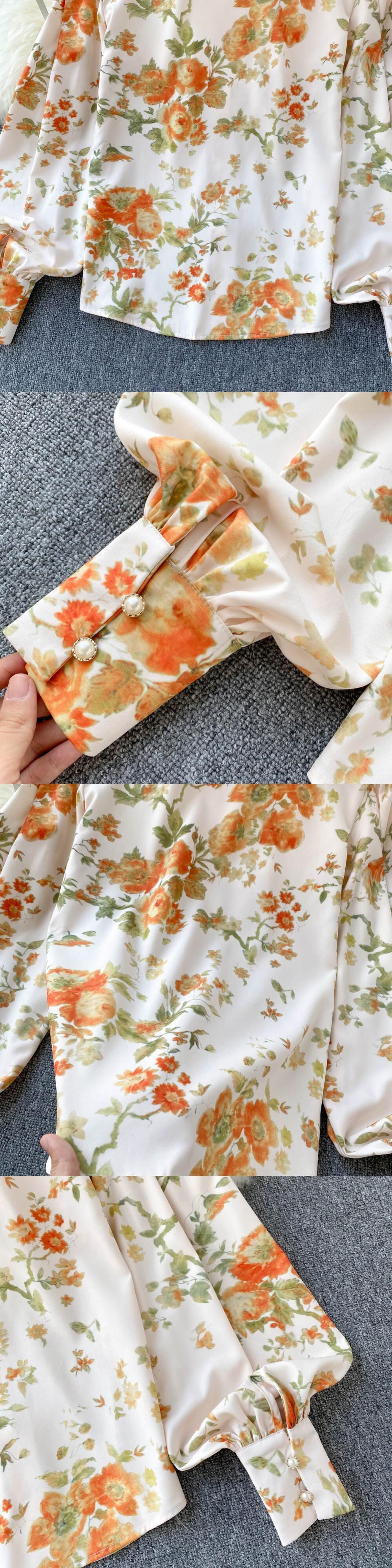 Romantic fairy palace style floral long-sleeved temperament shirt loose all-match elegant printed puff sleeves Western-style top ロング レース プリント エレガント 花柄 lyxaj31634598901