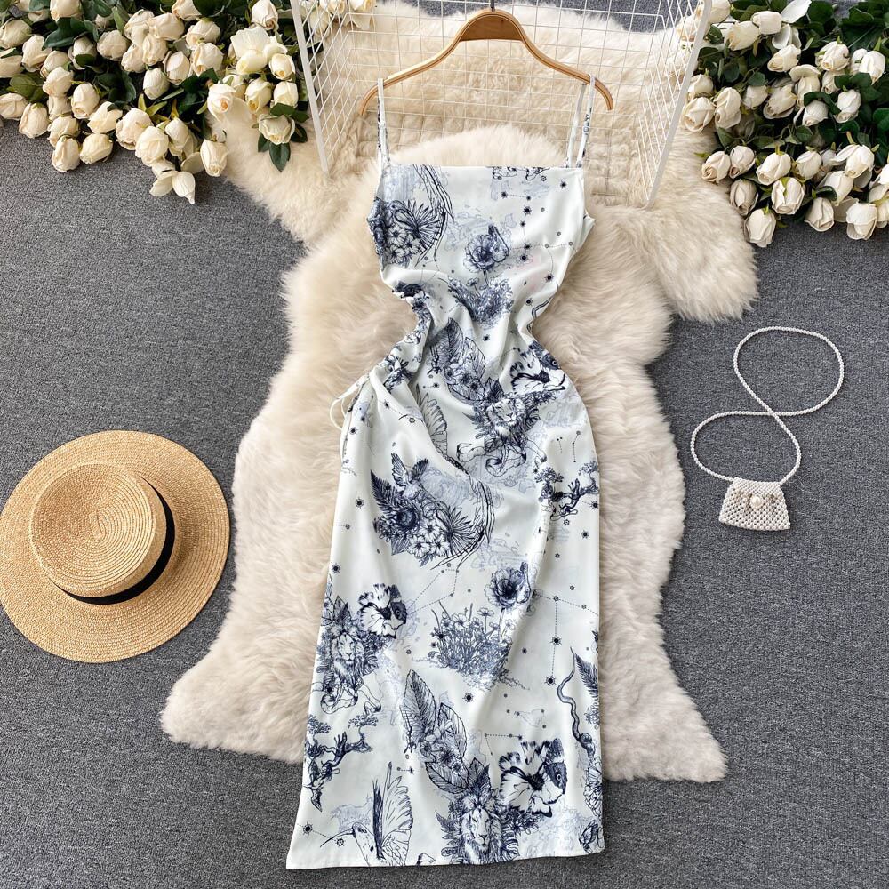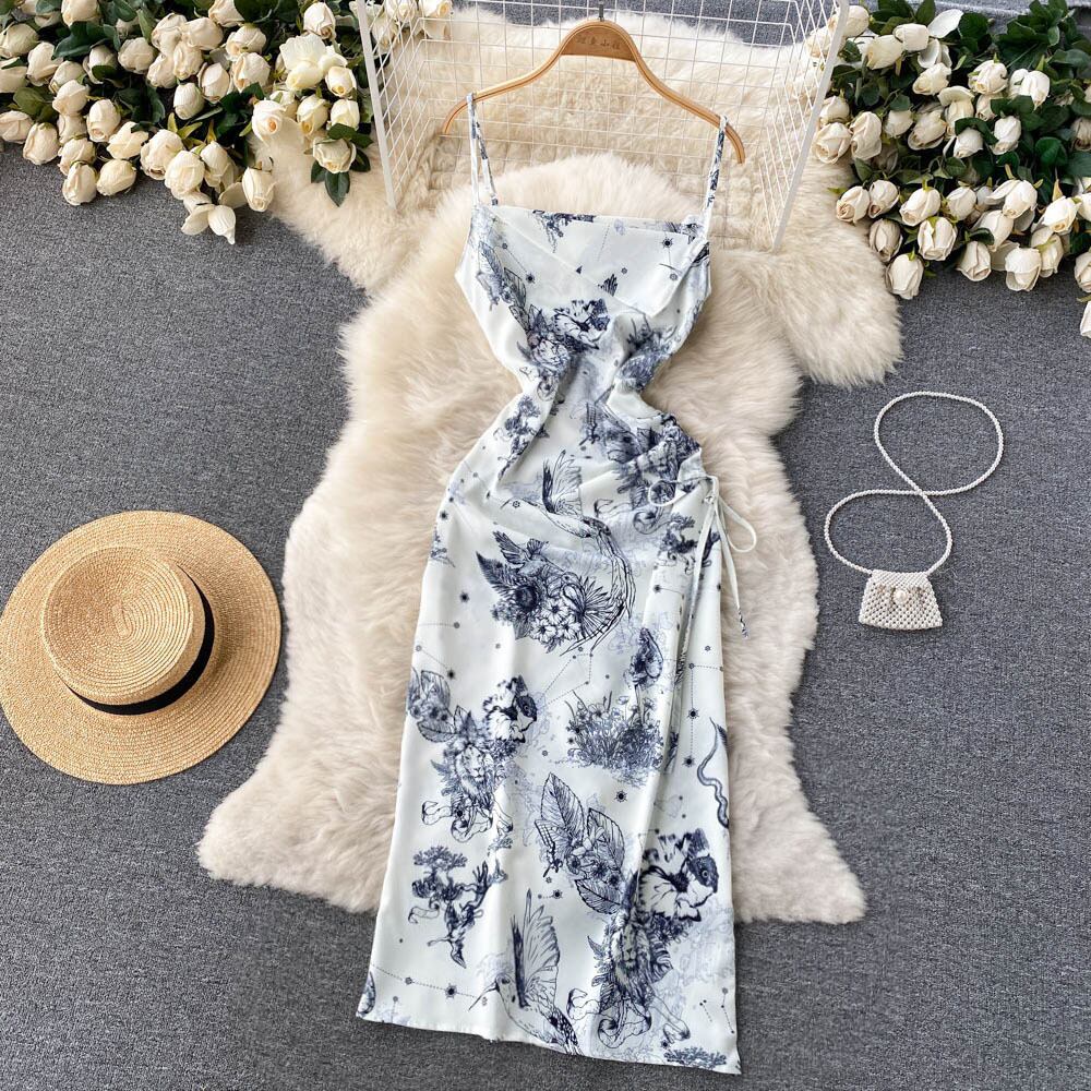 sense niche sloping collar French suspender dress 2022 summer new sexy slit drawstring long skirt women ロング サマー 夏物 スカート lyxaj16562221171