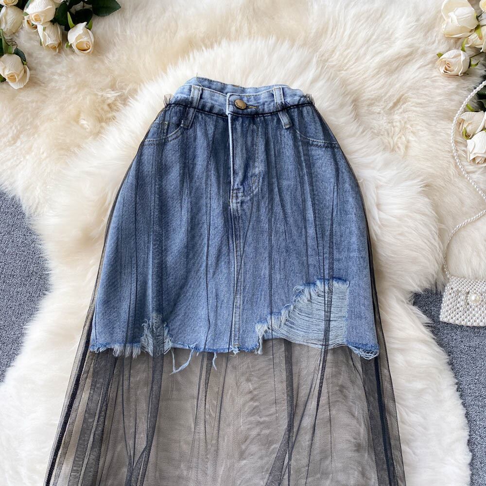 Summer version high waist slim black lace mesh skirt stitching denim skirt ripped skirt long skirt A-line skirt ハイウェスト ロング ブラック レース サマー 夏物 メッシュ スカート Aライン スリム ステッチ lyxaj67003774923