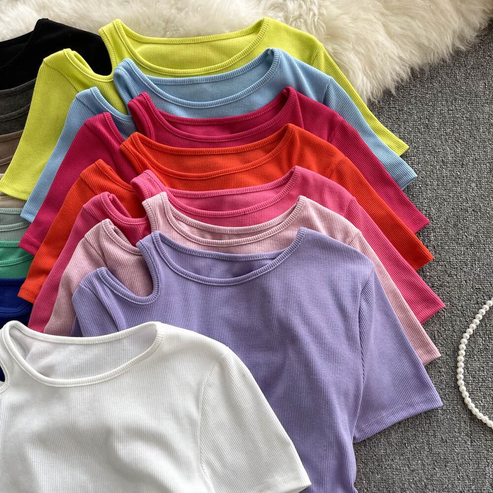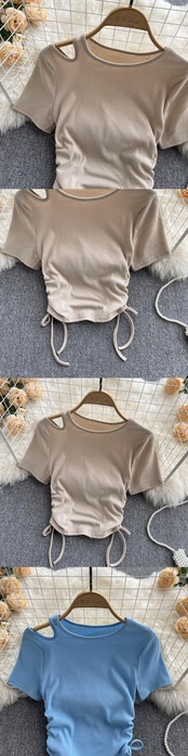 version hollow round neck short-sleeved t-shirt women's summer drawstring tie slim short cropped navel sweet and spicy top design sense ショート 大人ガーリー スウィート キュート カジュアル サマー 夏物 Oネック スリム Tシャツ lyxaj64349237451