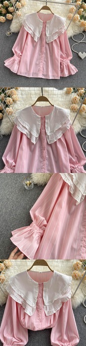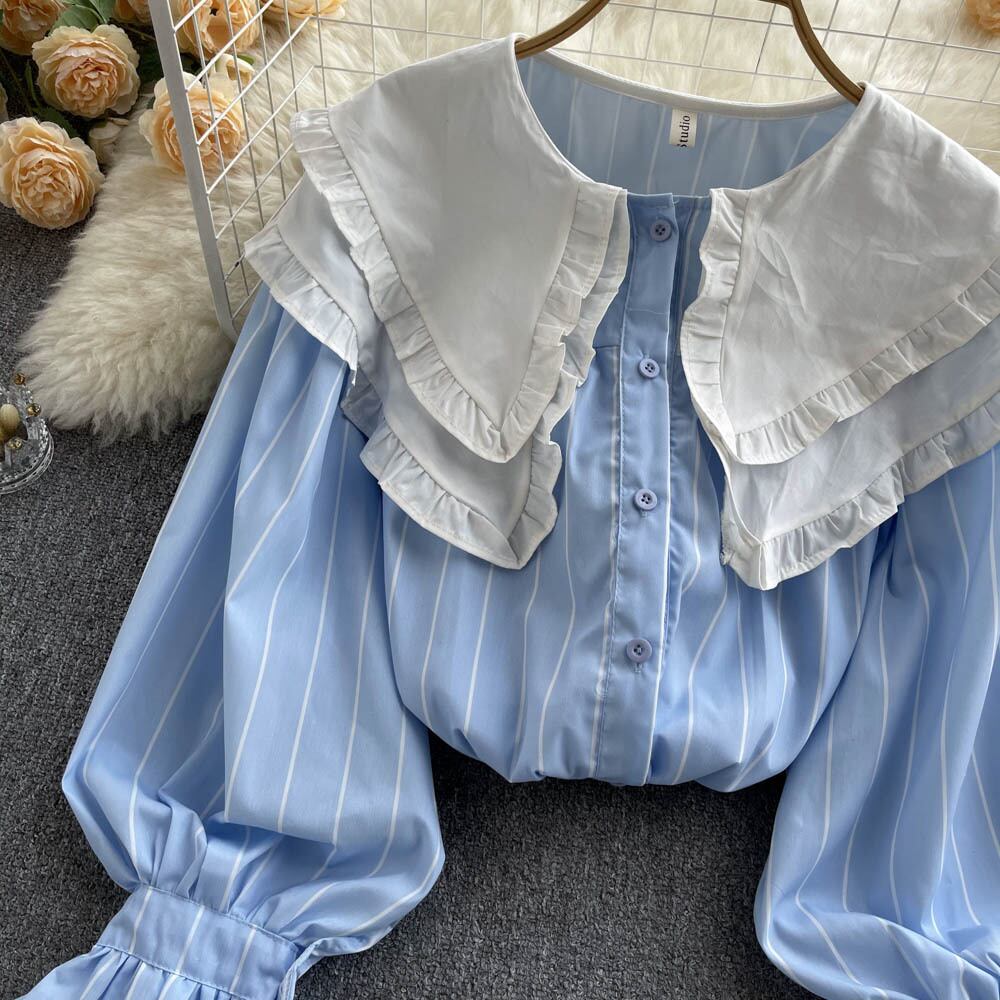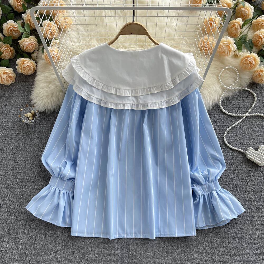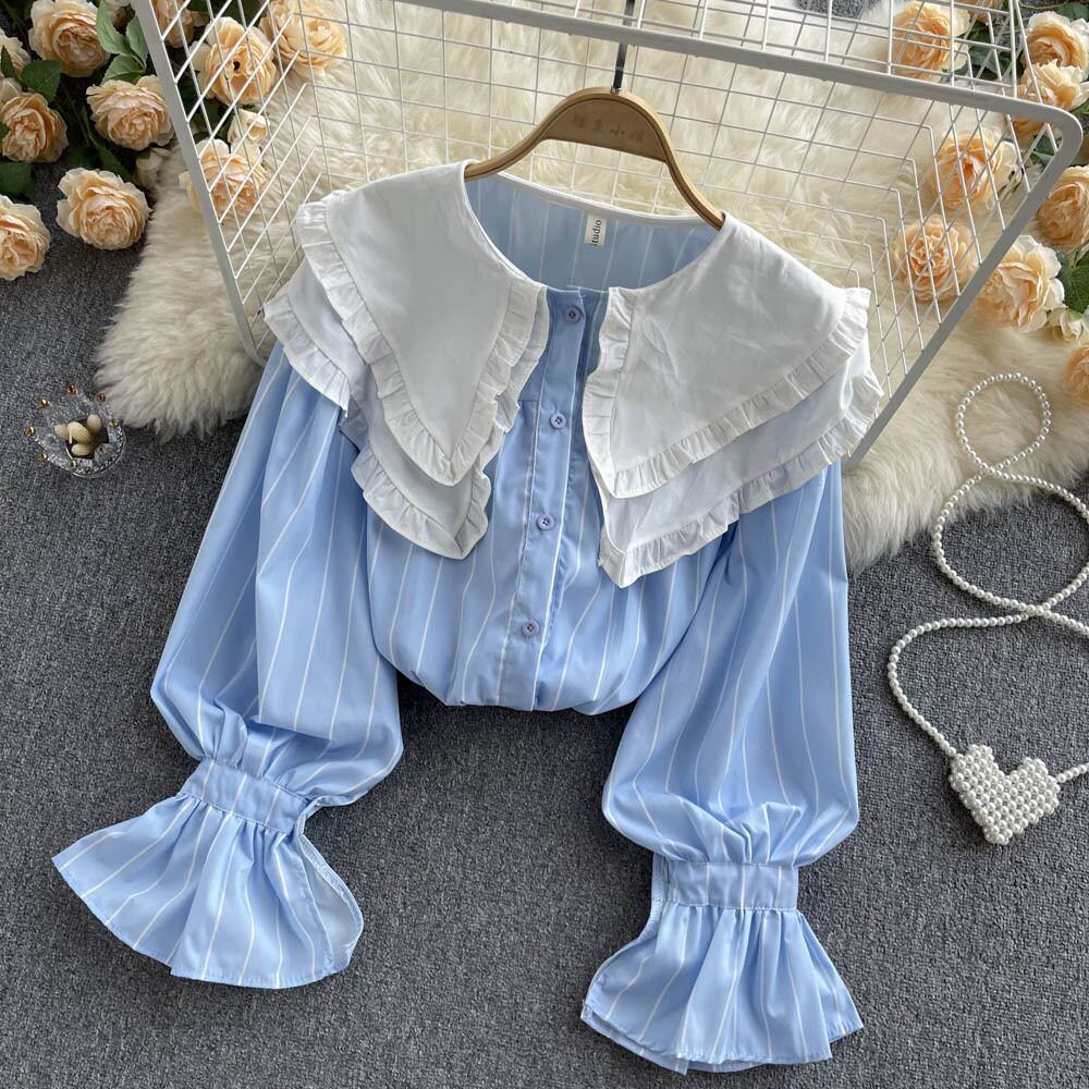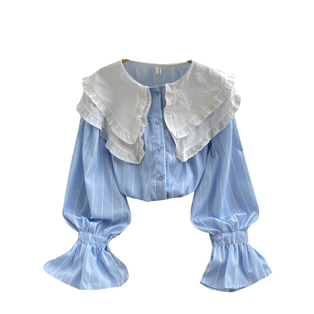 Sweet age-reducing ruffles contrast color lapel striped shirt women's spring new loose all-match bell-sleeved top trendy フリル ラッフル 大人ガーリー スウィート キュート カジュアル スプリング 春物 ストライプ lyxaj22699972693