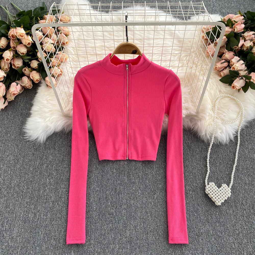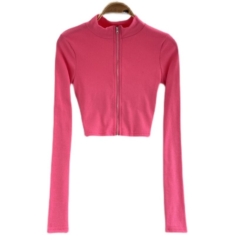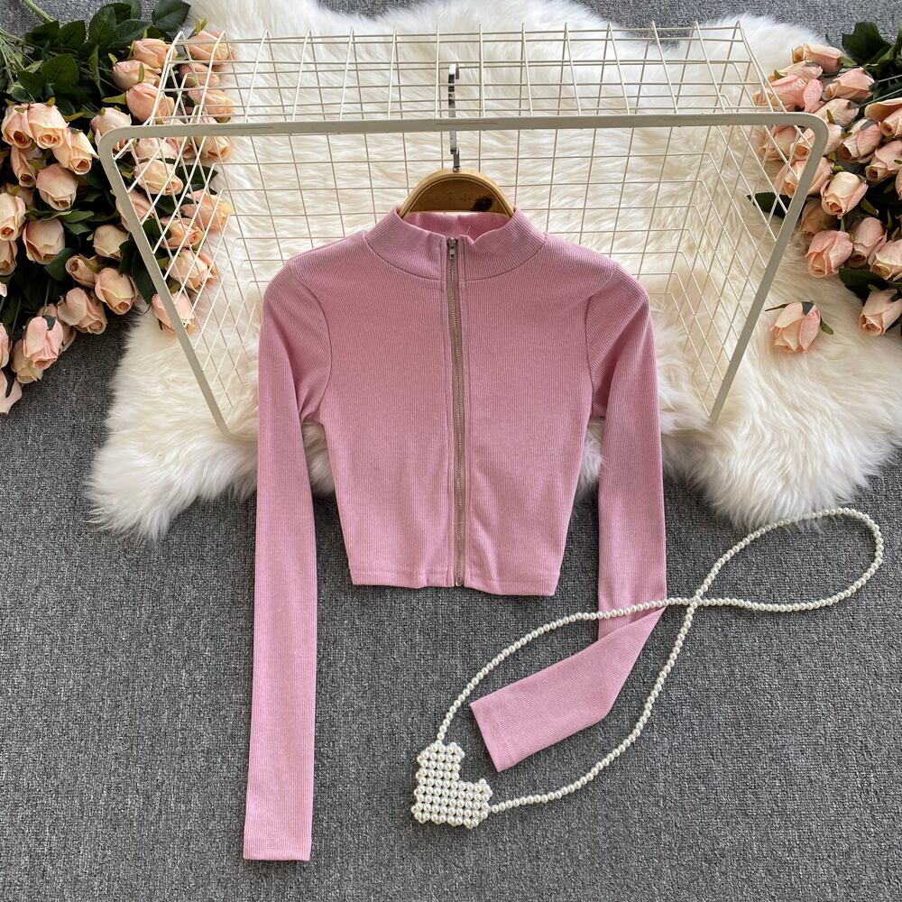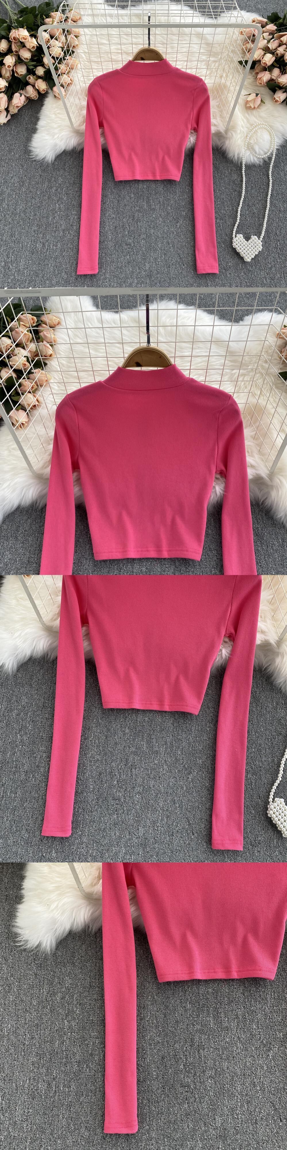 version chic temperament stand-up collar zipper long-sleeved t-shirt female ins trendy niche design slim short eign style top ショート ロング スリム Tシャツ lyxaj97071512378