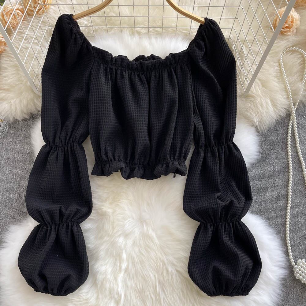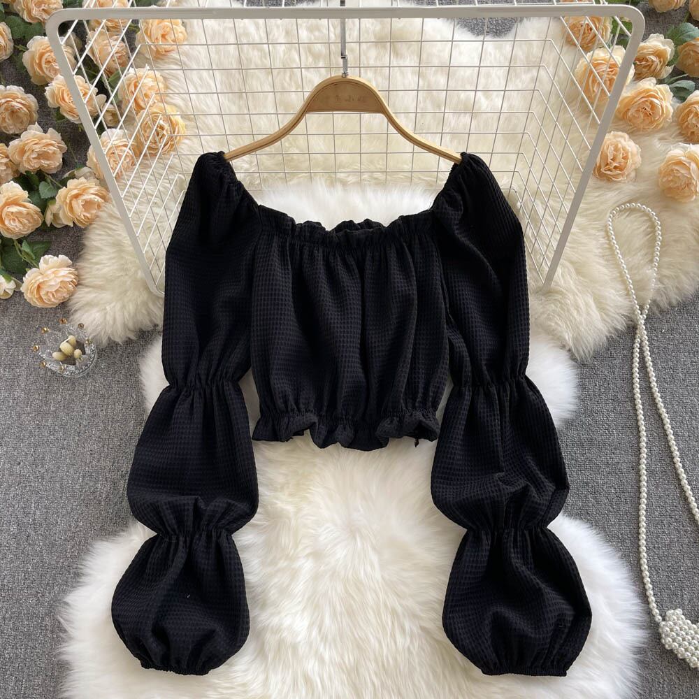 French niche scheming pleated trumpet long-sleeved fungus edge slim top female exposed collarbone square collar sweet shirt tide ロング 大人ガーリー スウィート キュート カジュアル プリーツ スリム スクウェア lyxaj65149600654