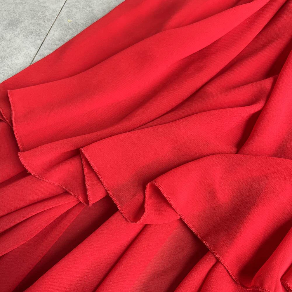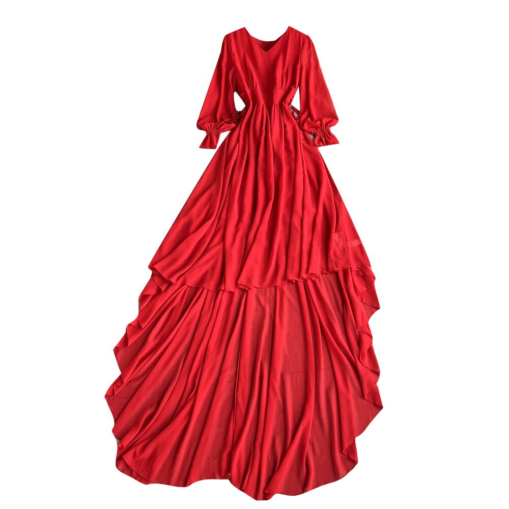 Red dress travel skirt high-end temperament goddess fan waist slim V-neck long-sleeved seaside holiday skirt women ロング レッド スカート Vネック スリム lyxaj59493681269