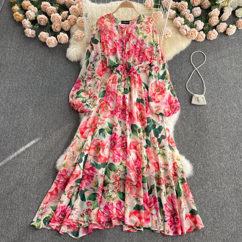 Celebrity style skirt high-end women's western style puff sleeves slim long dress goddess elegant print dress ロング エレガント スカート スリム lyxaj44672806364