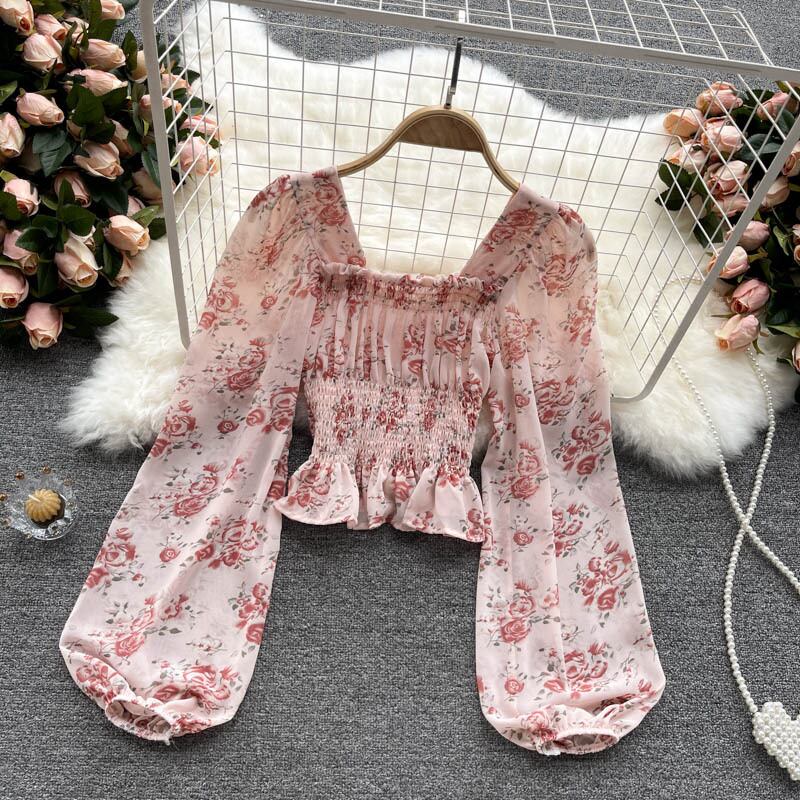 French sweet printed chiffon shirt summer dress 2021 new women's age-reducing puff sleeves slim short top women ショート シフォン プリント 大人ガーリー スウィート キュート カジュアル サマー 夏物 スリム lyxaj30312889327