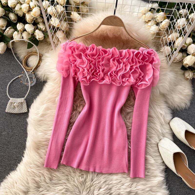 able knitted top women's design sense niche three-dimensional flower one-word neck off-the-shoulder long-sleeved bottoming shirt women's autumn and winter all-match ロング オータム 秋物 ウィンター 冬物 フラワーデザイン lyxaj93246721306