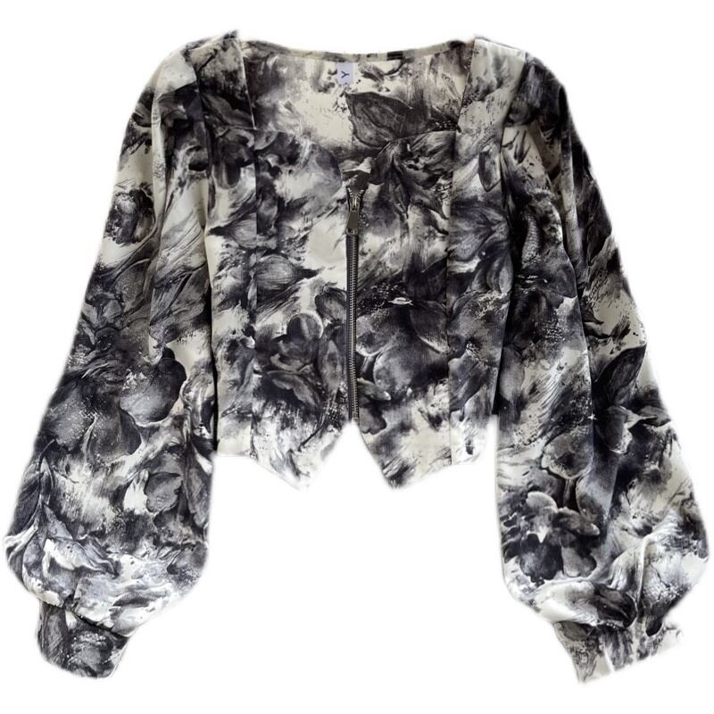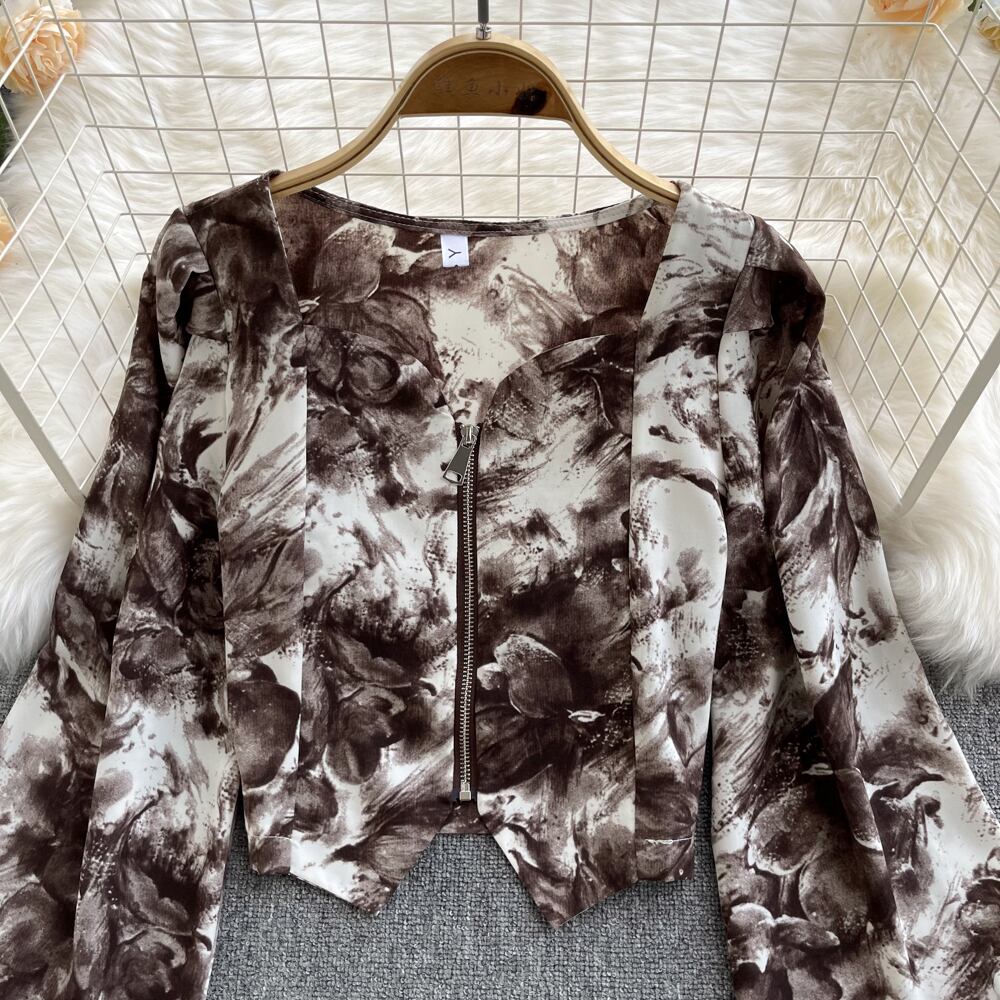 French temperament tie-dye zipper chic top slim fit and thin short shirt design niche puff sleeve top ショート スリム lyxaj21327345554
