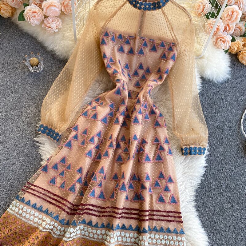 Heavy industry European and American retro palace style dress women's round neck puff sleeves mesh stitching embroidery hook flower high-end skirt レトロ レース 刺繍 メッシュ スカート Oネック フラワーデザイン ヨーロピアン ステッチ lyxaj22123439084