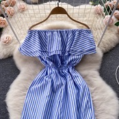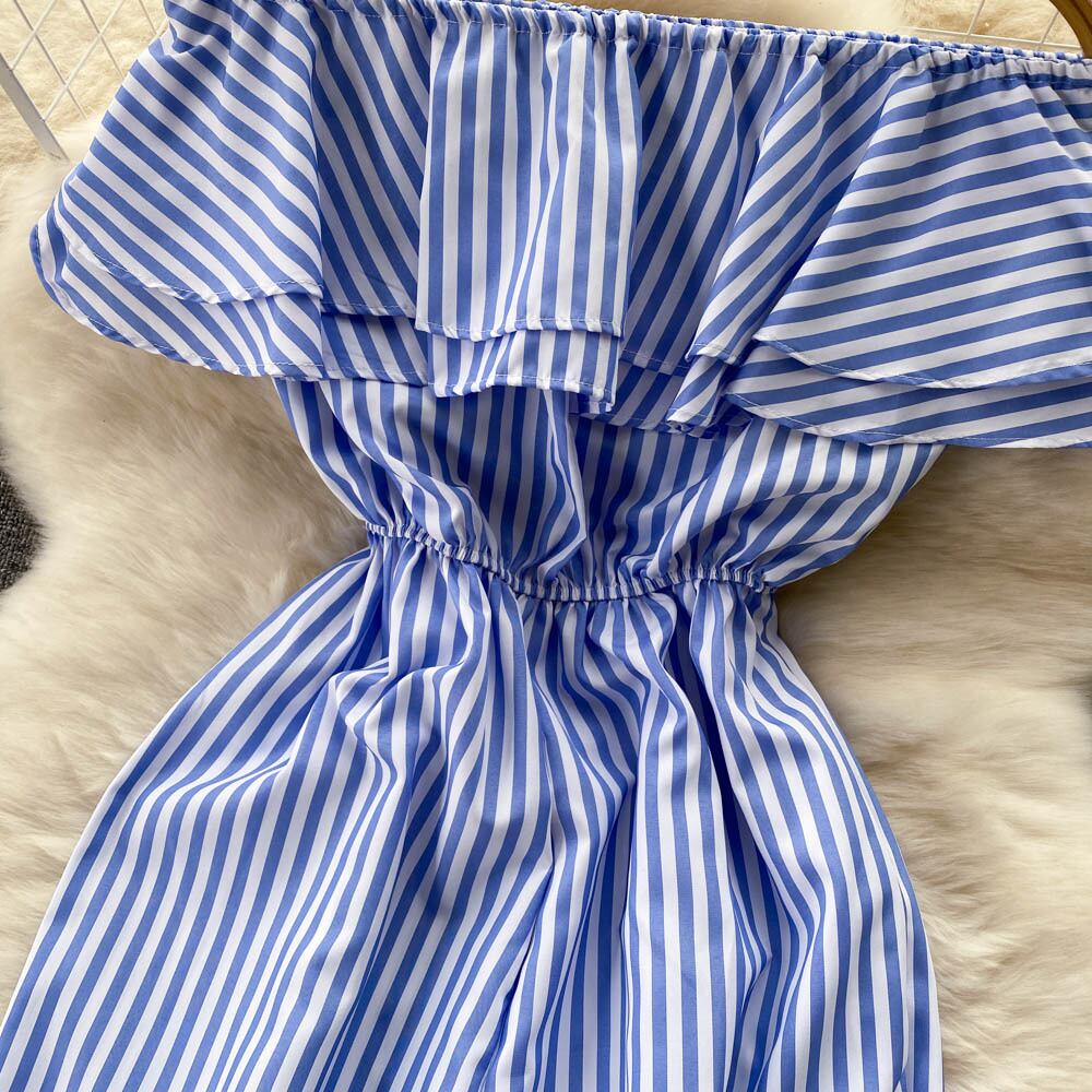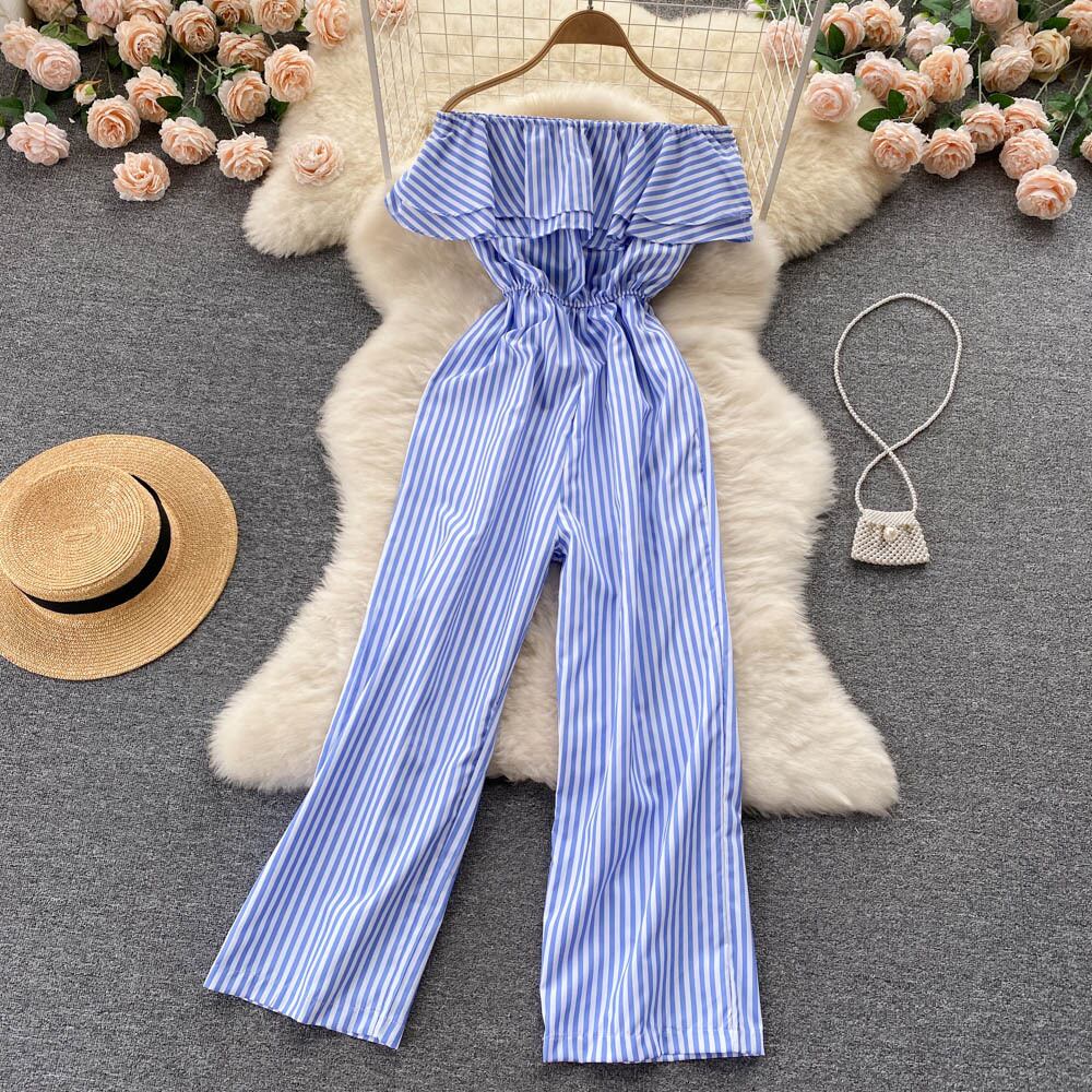chic summer new simple temperament one-shoulder waist casual striped jumpsuit drape wide-leg trousers カジュアル サマー 夏物 ストライプ lyxaj73121361101