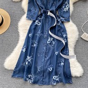 -end temperament denim shirt dress women's lapel single-breasted mid-length waist-length printed A-line skirt プリント スカート Aライン lyxaj23781708902