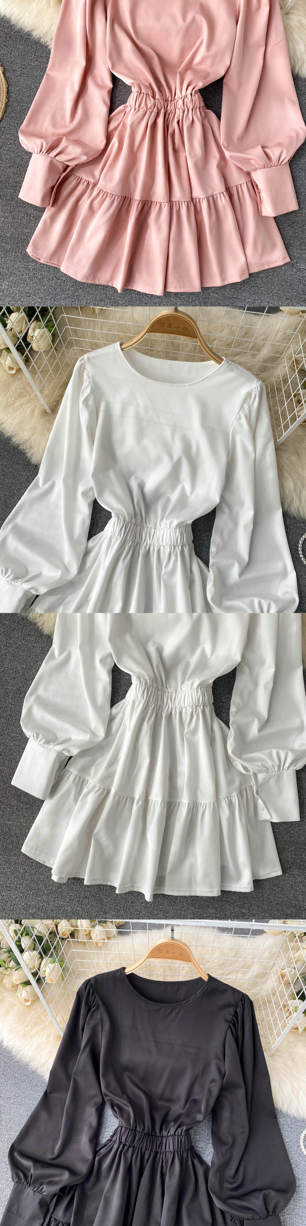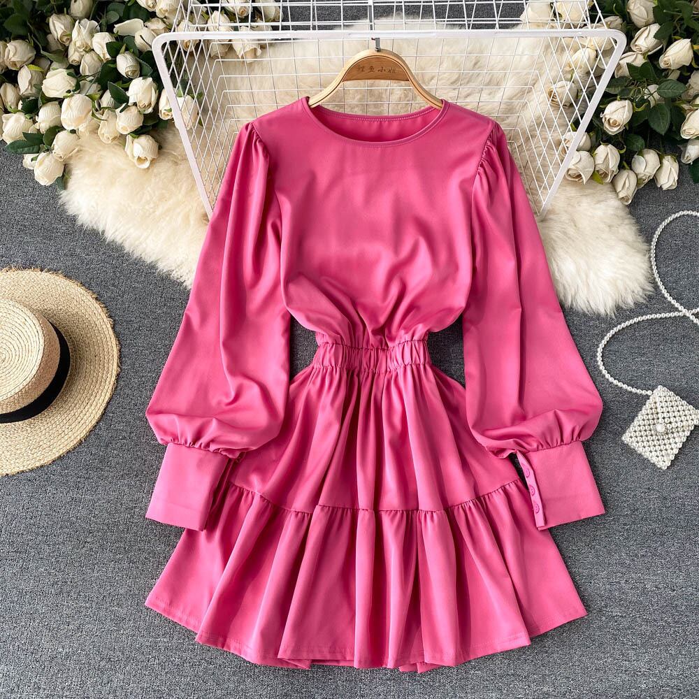 Autumn dress small solid color simple puff sleeves French niche waist slimming temperament age-reducing pleated skirt プリーツ オータム 秋物 スカート ソリッドカラー lyxaj44202882930