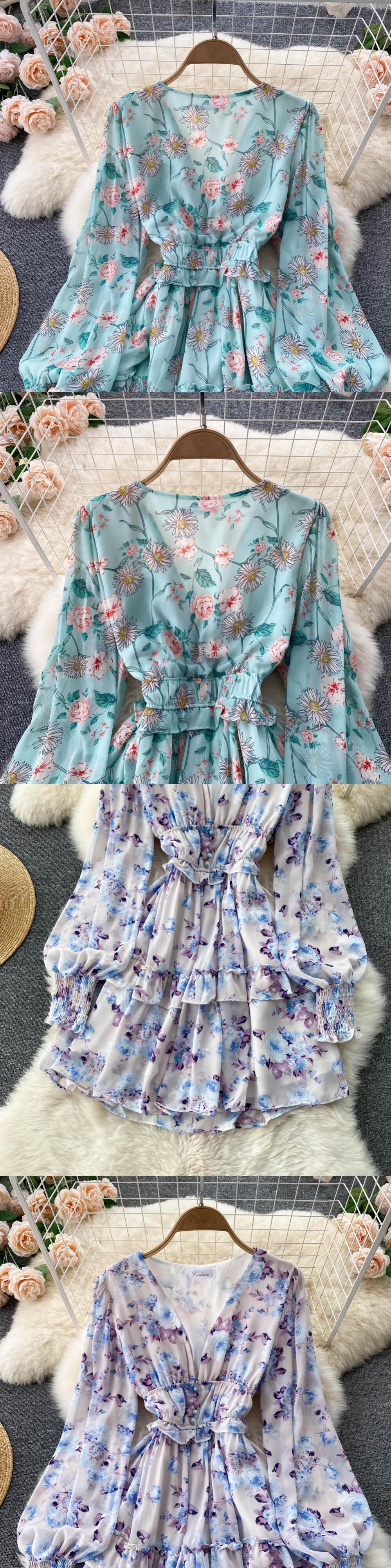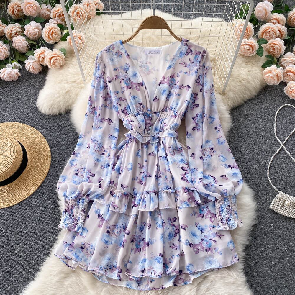 Autumn women's clothing 2021 new French temperament V-neck high-waisted slim and elegant printed ruffled fairy skirt プリント エレガント オータム 秋物 スカート Vネック スリム lyxaj20497494476
