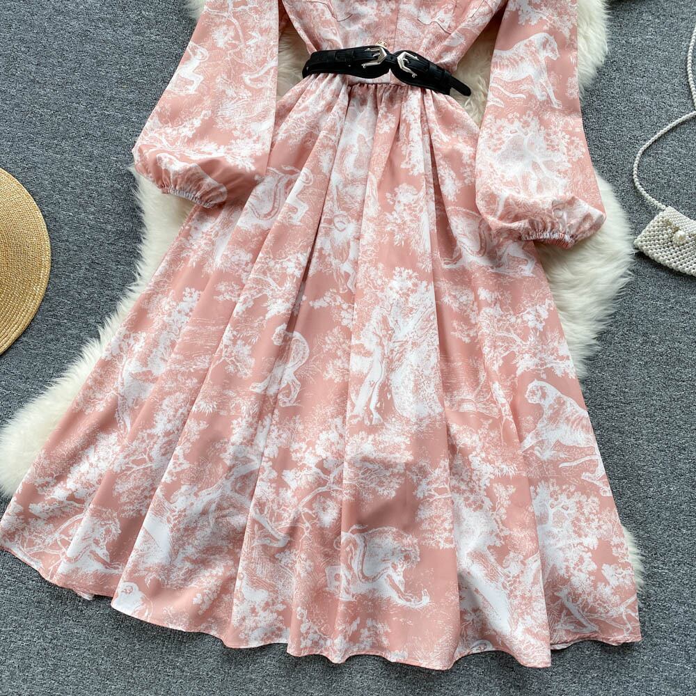 2022 early spring new niche lapel print waist slim dress fluffy doll skirt princess pleated skirt プリーツ ふわふわ スプリング 春物 スカート スリム lyxaj89502873178