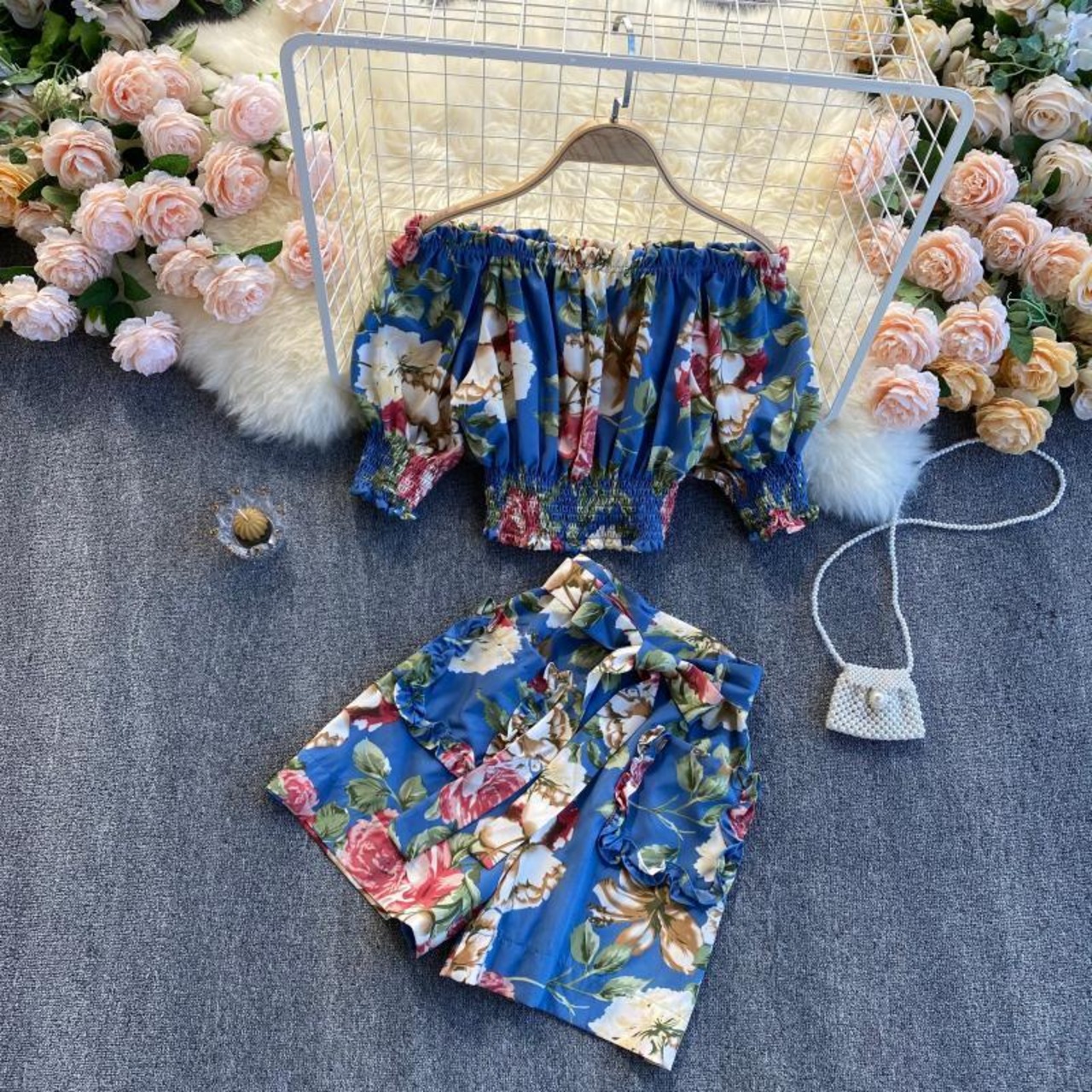Small man holiday style suit two-piece women's eign style puff sleeves one-word collar strapless top short wide-leg pants ショート lyxaj71557118236
