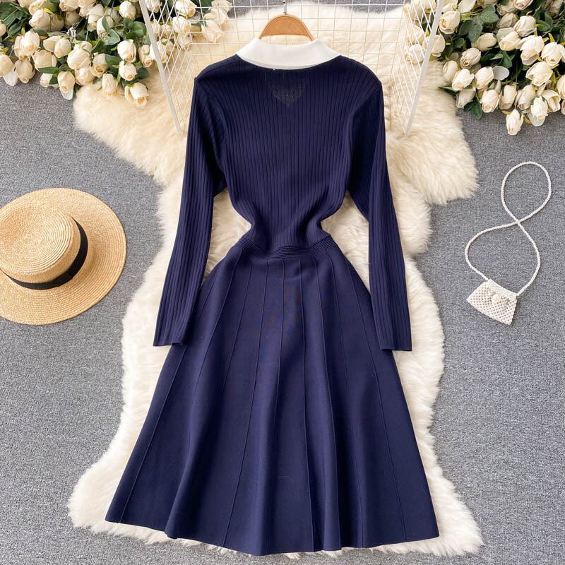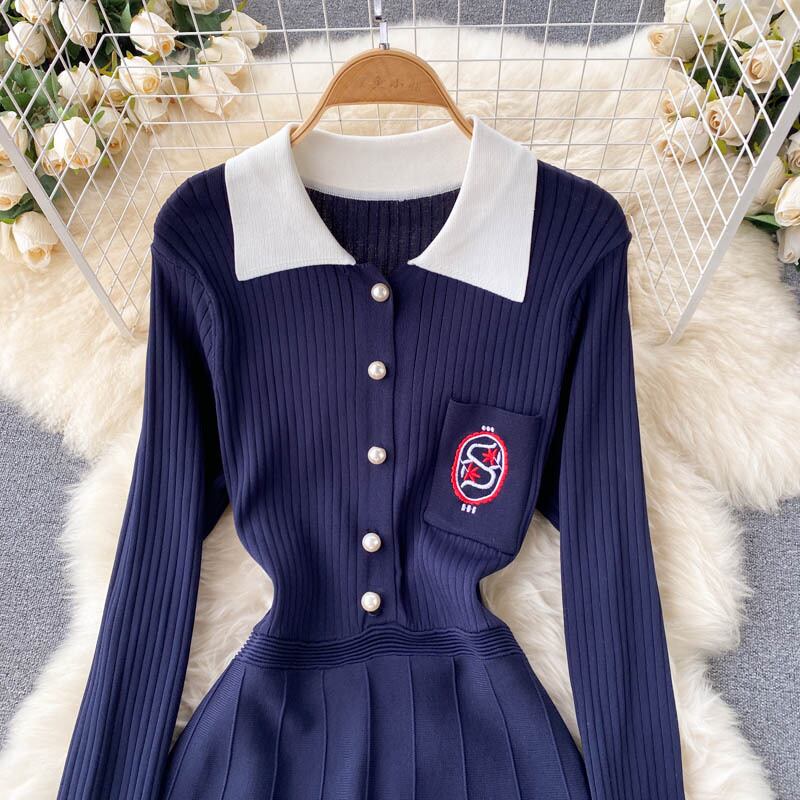 Autumn new college style polo collar embroidery waist pearl stitching knitted dress bottoming sweater skirt women 刺繍 オータム 秋物 スカート パール 真珠 ステッチ lyxaj67510727034