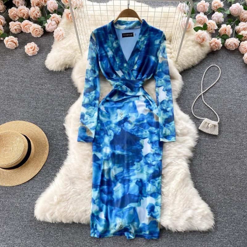 Feminine V-neck slim fit long-sleeved printed hip dress ロング プリント Vネック スリム lyxaj3294857204