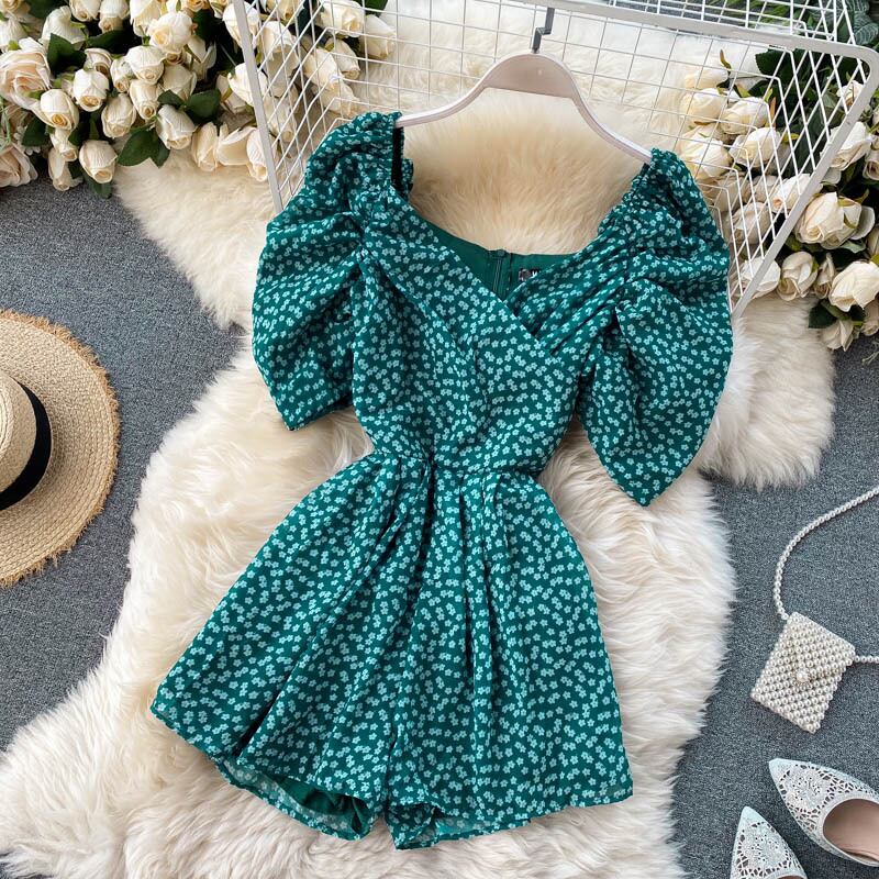 European and American ins fashion bloggers vacation style jumpsuits puff sleeves pleated V-neck slim short section floral wide-leg pants ショート プリーツ 花柄 Vネック スリム ヨーロピアン lyxaj32435225356