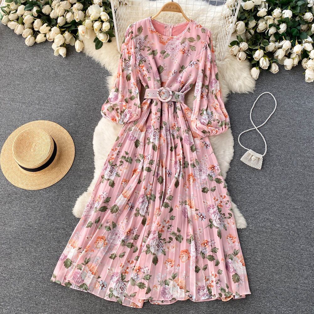 Dress female 2022 spring new goddess Fan Chaoxian sweet puff sleeve floral skirt pleated over the knee long skirt ロング 大人ガーリー スウィート キュート カジュアル プリーツ スプリング 春物 花柄 スカート lyxaj99989642978