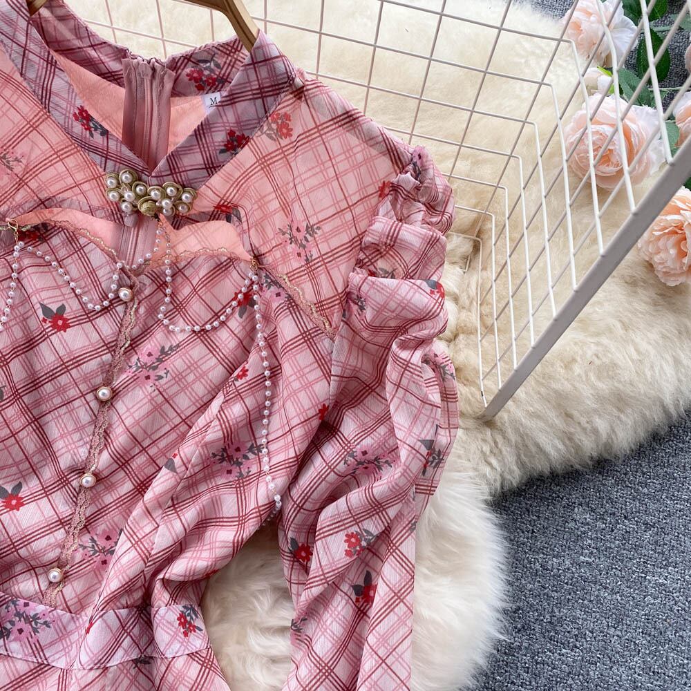 2022 spring new design sense plaid floral cheongsam collar removable hanging chain lace waist a-line dress trendy レース スプリング 春物 花柄 Aライン チェーン lyxaj12607940025