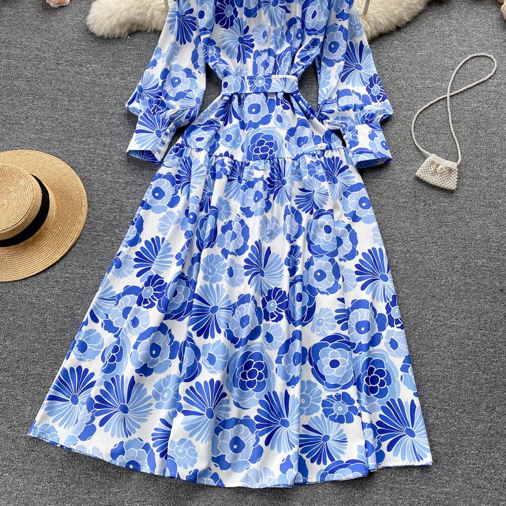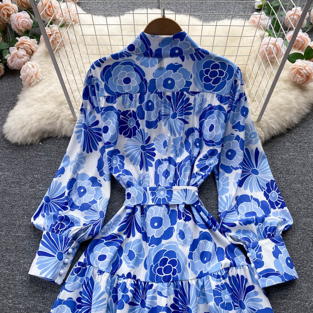 Light familiar style stand-up collar high-waisted single-breasted long-sleeved blue print dress elegant temperament a-line large swing long skirt spring ロング ブルー エレガント スプリング 春物 スカート Aライン lyxaj48220576065