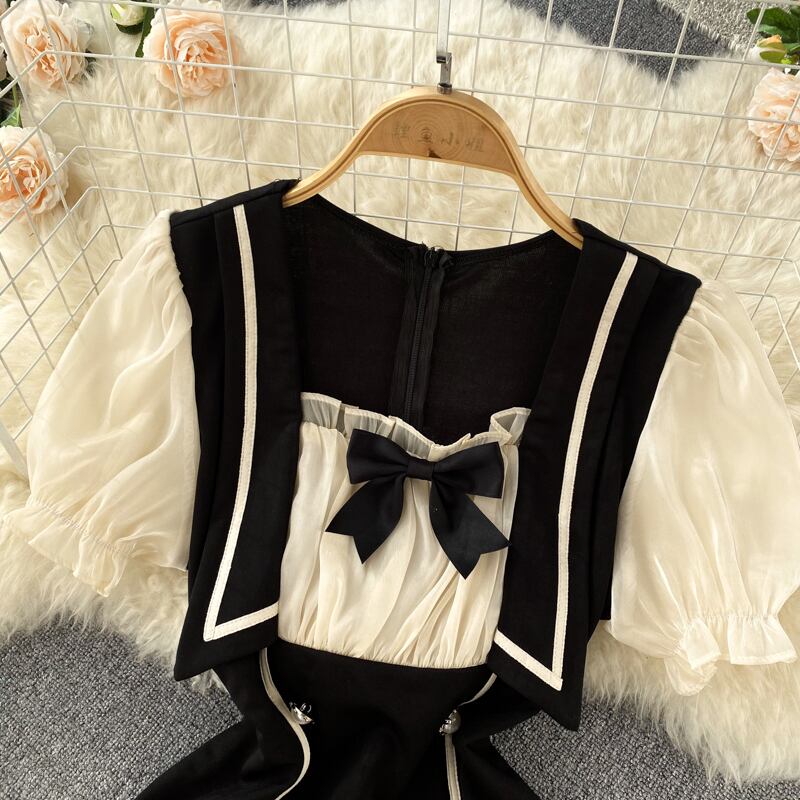 2022 spring and summer new design sense Hepburn little black dress stitched with navy bow knot slim A-line dress trend ブラック リボン スプリング 春物 サマー 夏物 Aライン スリム ステッチ lyxaj9717080815