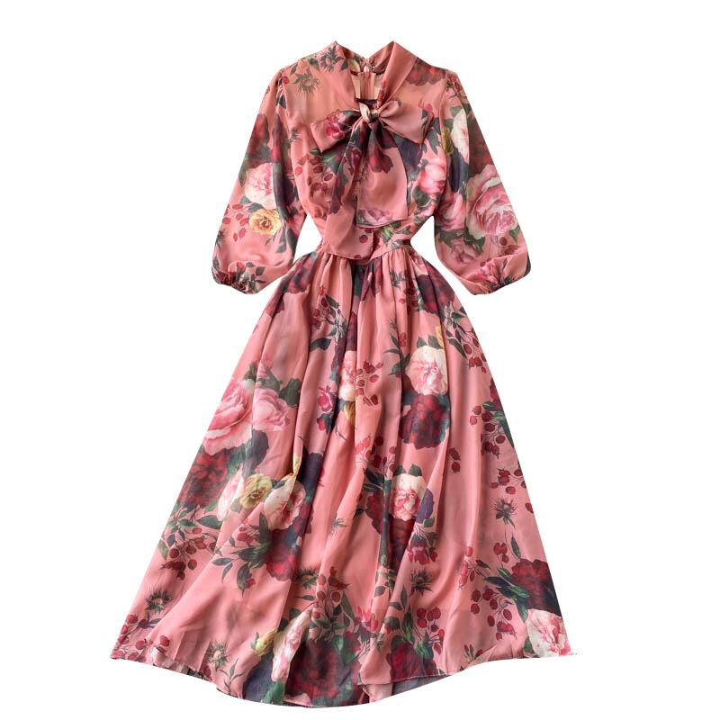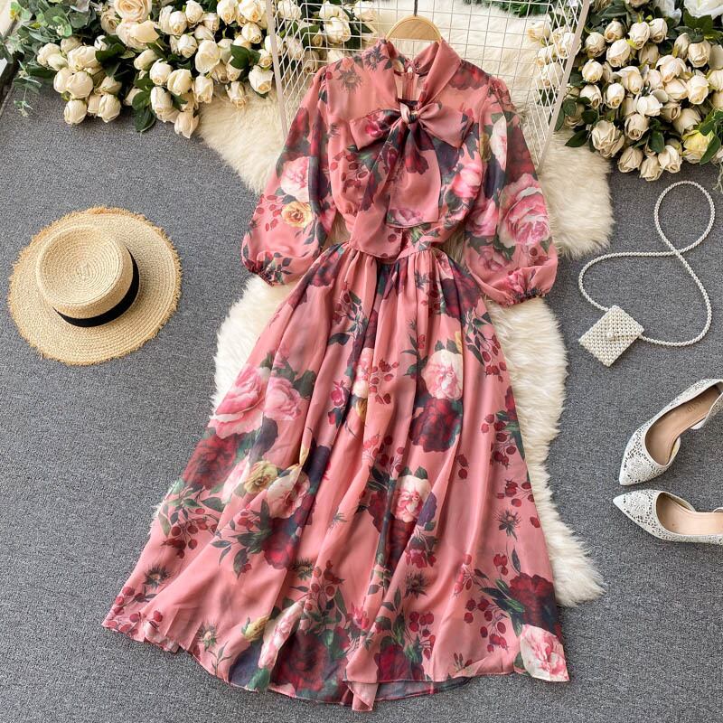 Feminine celebrity temperament high-end dress v-neck bow puff sleeves waist slim flower print skirt リボン スカート Vネック スリム フラワーデザイン lyxaj60578335311