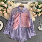 Shirt women's design sense niche scheming pleated contrast color ruffles fashionable all-match long-sleeved shirts striped tops trendy ロング フリル ラッフル シャツ プリーツ ストライプ lyxaj60219958679