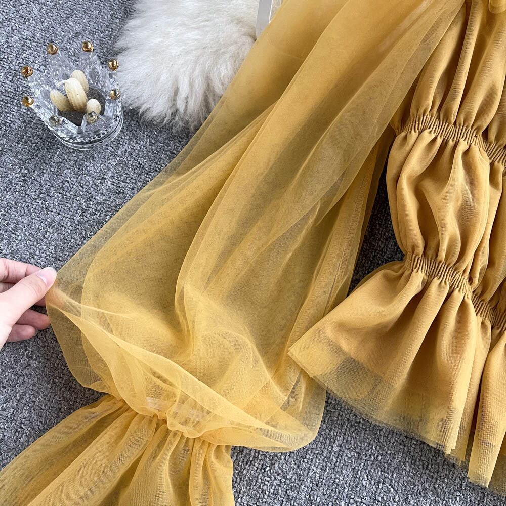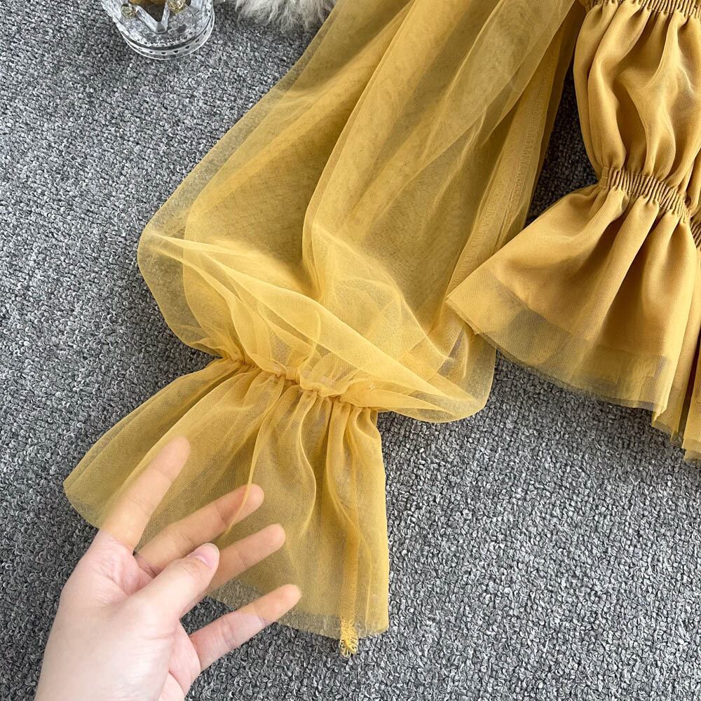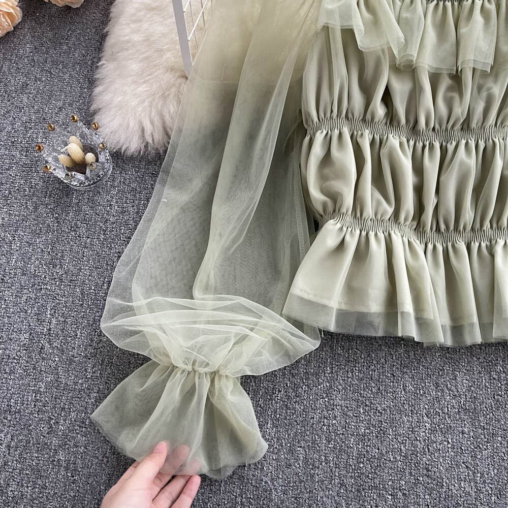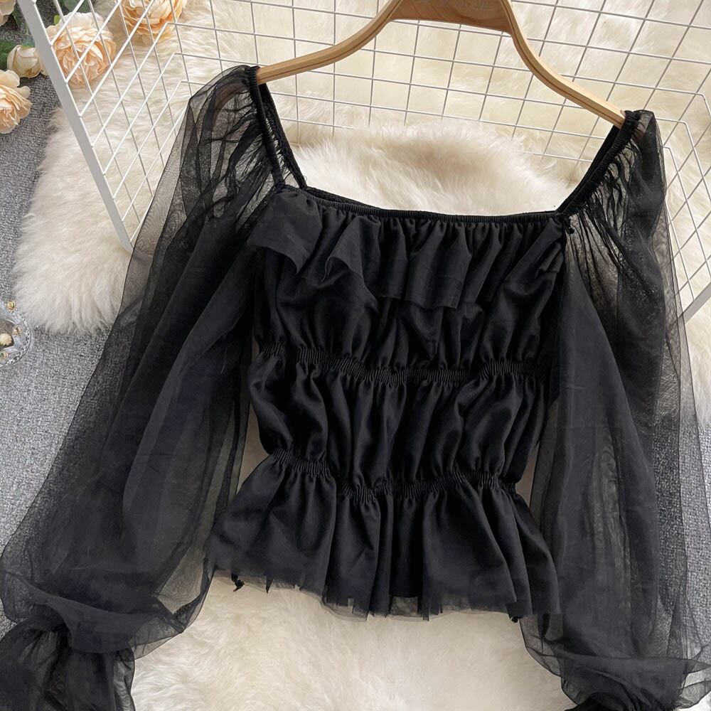 2022 summer new French retro puff sleeve pleated slim fit square collar shirt horn sleeve long sleeve shirt ロング ベルスリーブ レトロ 長袖 プリーツ サマー 夏物 スリム スクウェア lyxaj99666984062