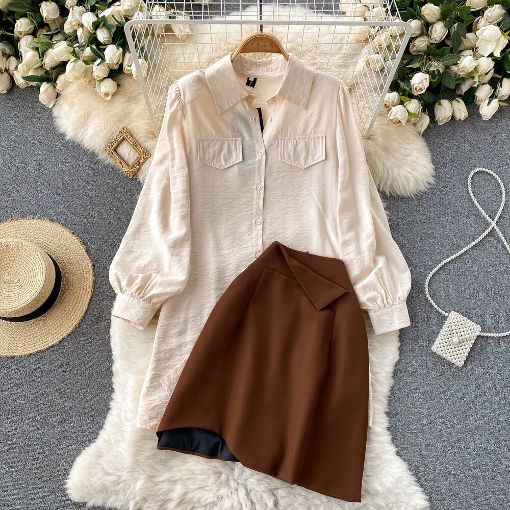 Niche design sense mid-length shirt skirt women's irregular high waist A-line skirt temperament and age reduction two-piece suit ハイウェスト スカート Aライン lyxaj20518286699