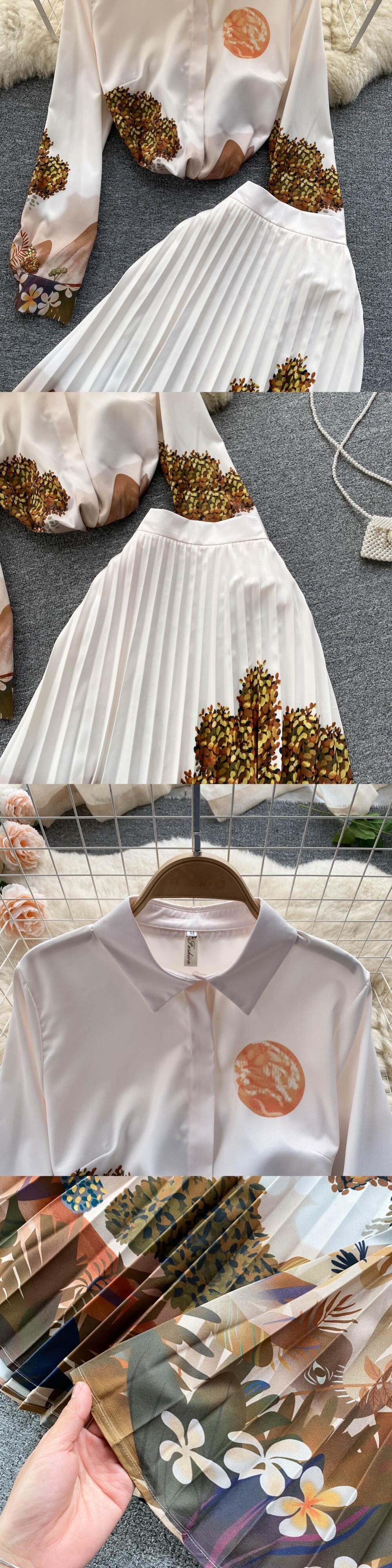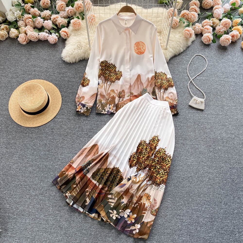 suit high-end satin print loose and thin temperament shirt women's high waist pleated skirt two-piece set ハイウェスト プリーツ スカート サテン lyxaj31659455543