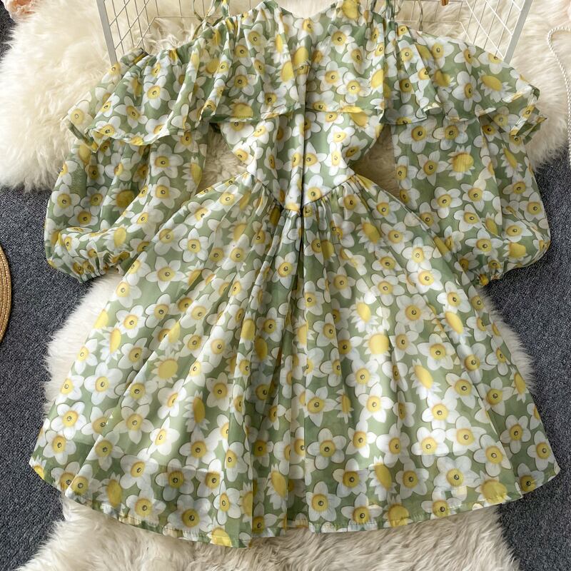 One word neck suspender design sense niche fairy doll skirt gentle temperament floral ruffled holiday style dress 花柄 スカート lyxaj29143820899