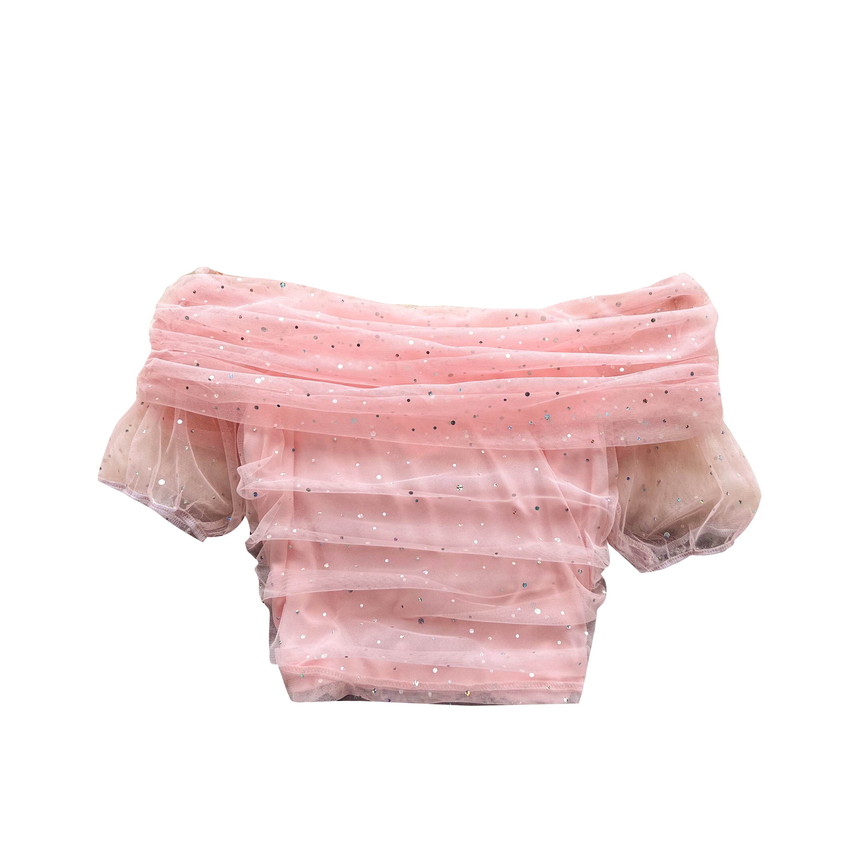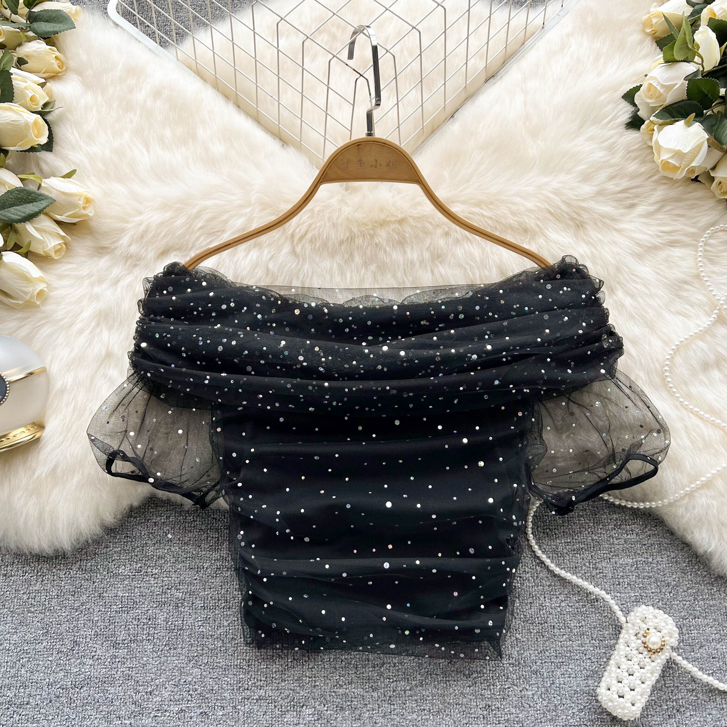 Pure desire sexy summer version niche one-shoulder tube top heavy industry sequins short mesh short-sleeved top trendy ショート サマー 夏物 メッシュ lyxaj9361457406