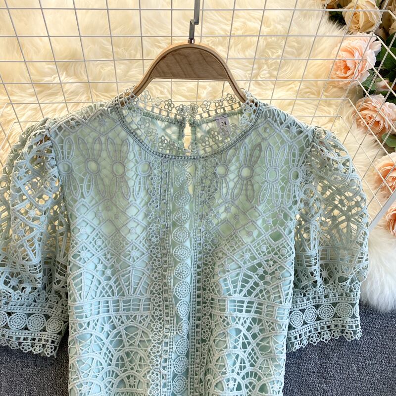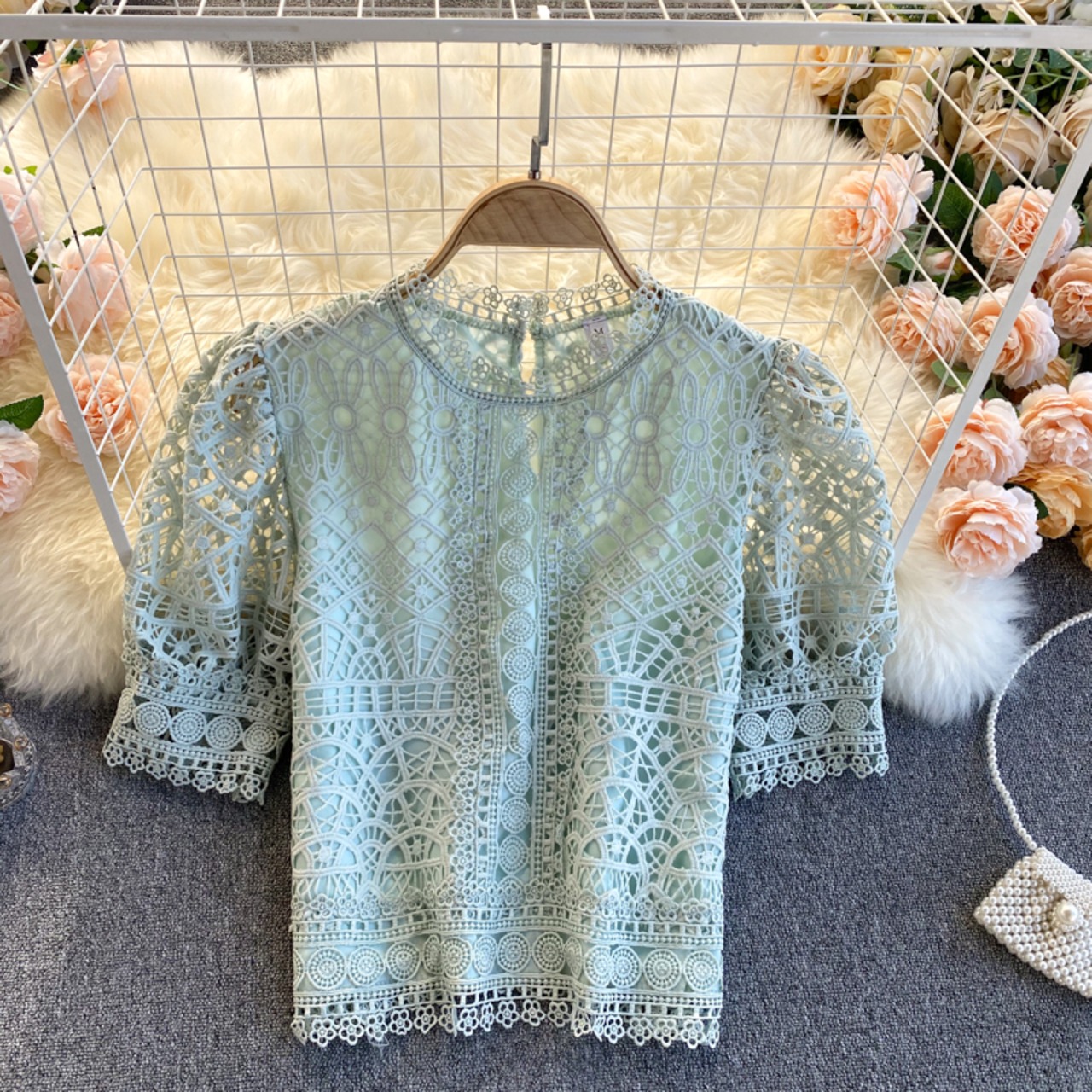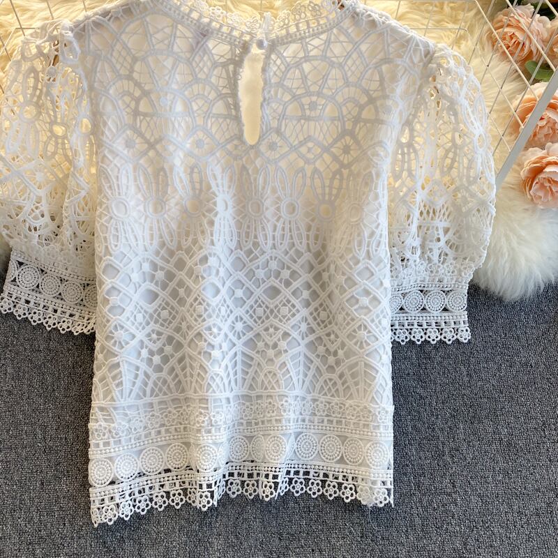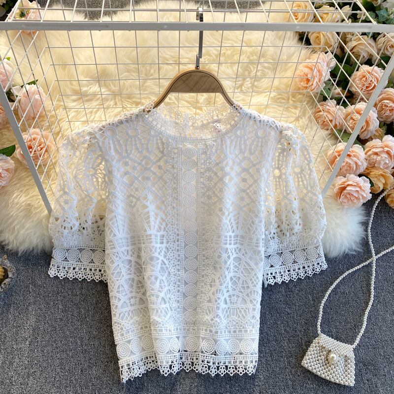 Han Fan's small fresh and sweet lace bottoming shirt women's slim short hollow top spring clothes 2021 new women's trend ショート レース 大人ガーリー スウィート キュート カジュアル スプリング 春物 スリム lyxaj81241696903