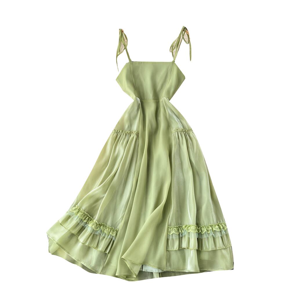 Pleated fungus edge suspender skirt 2022 summer new mid-length gentle super fairy skirt chiffon pleated dress シフォン プリーツ サマー 夏物 スカート lyxaj95654843458