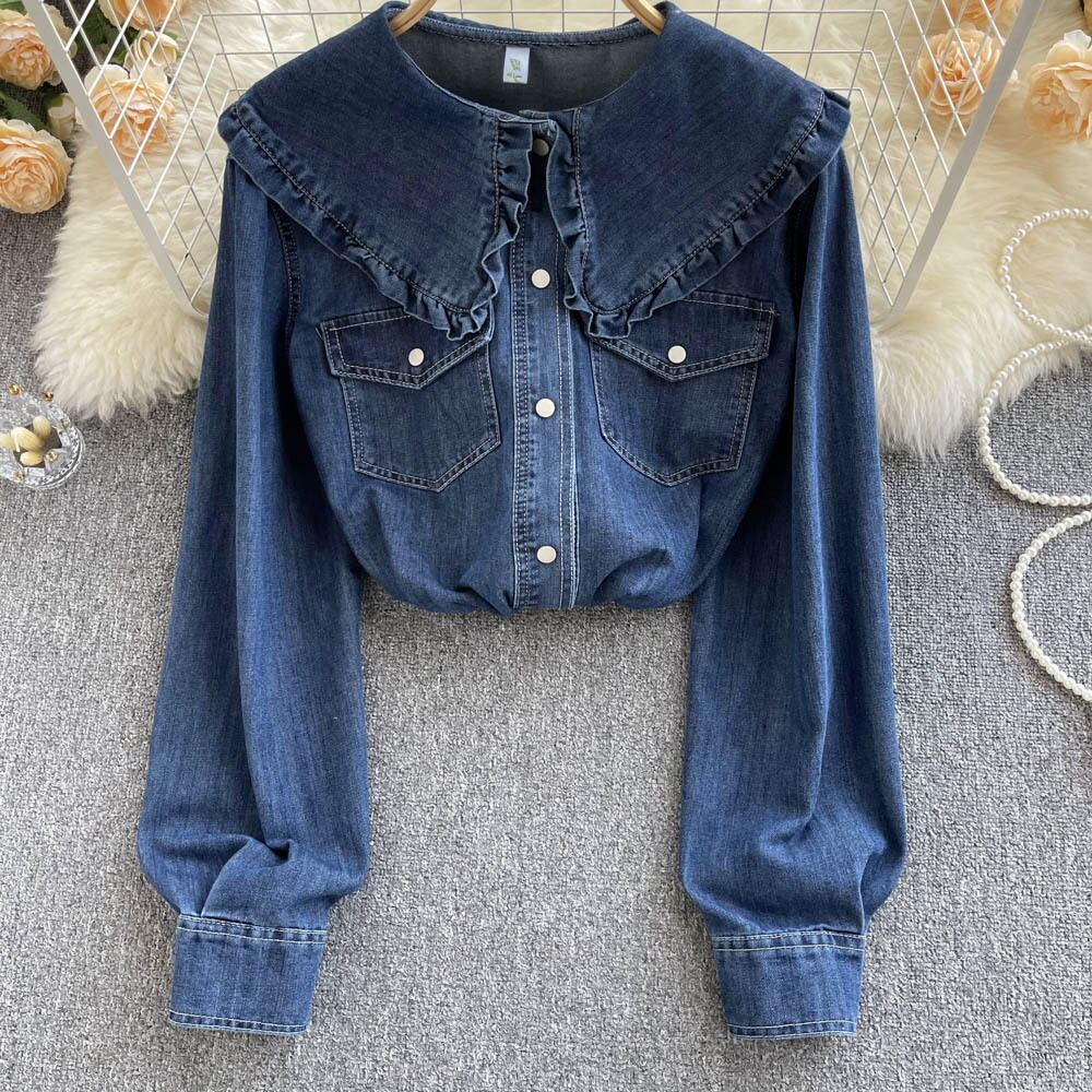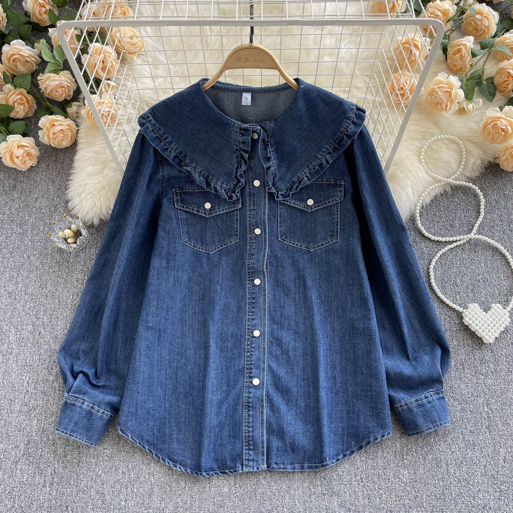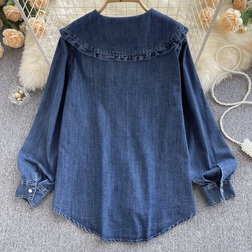 Sweet fungus edge doll collar loose all-match top women chic Hong Kong style retro denim shirt women 2022 spring レトロ 大人ガーリー スウィート キュート カジュアル スプリング 春物 lyxaj31054975695