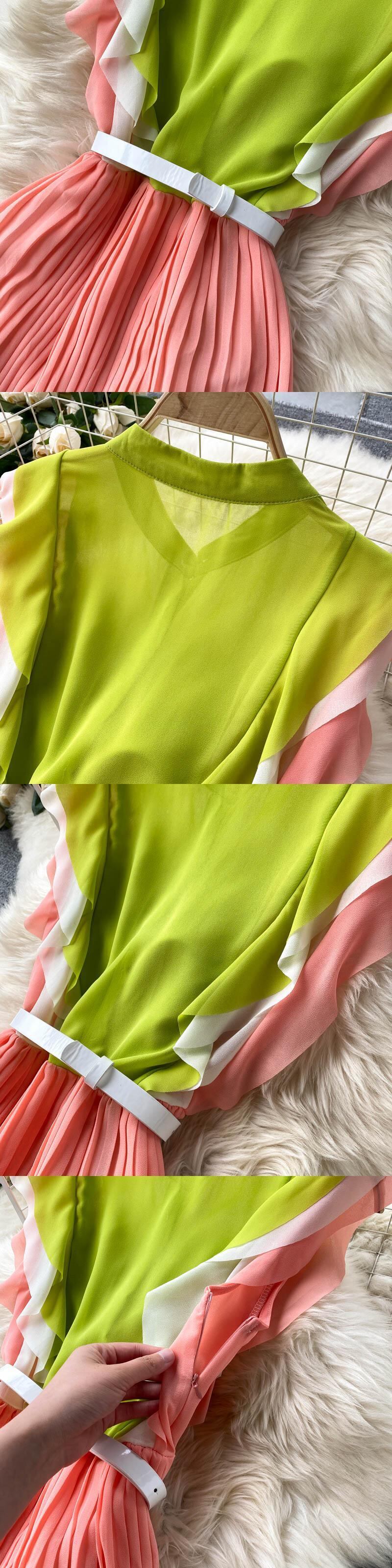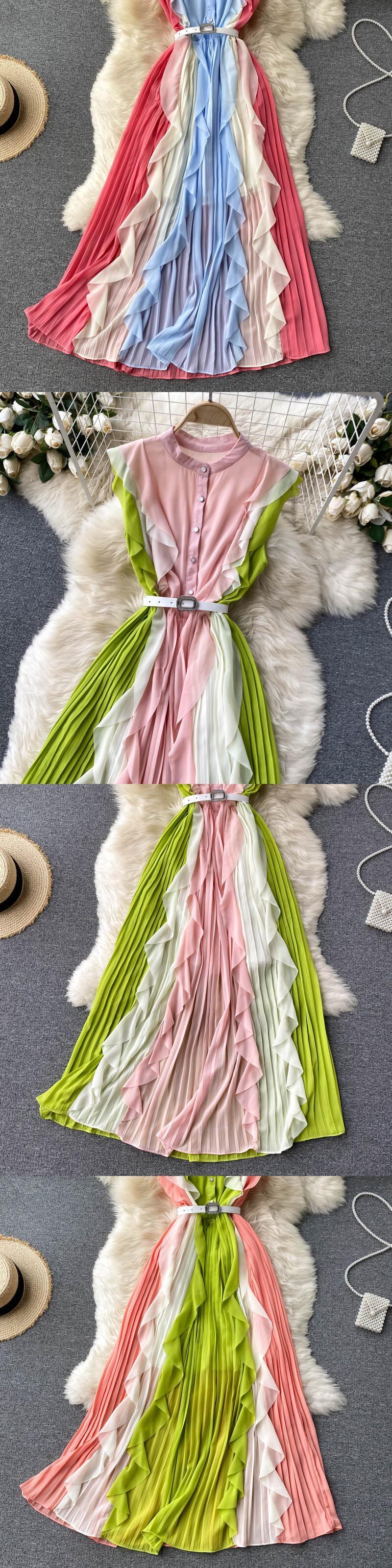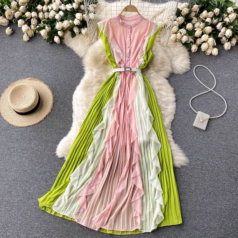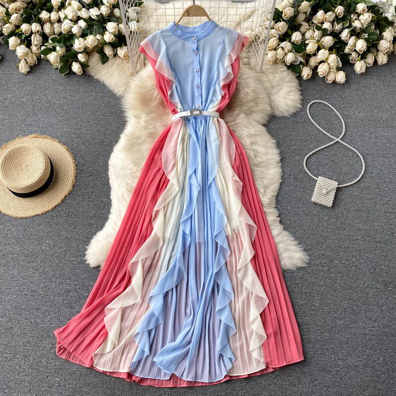 Chiffon dress women's summer dress 2021 new design sense color matching lotus leaf slim long pleated holiday skirt ロング シフォン プリーツ サマー 夏物 スカート スリム lyxaj9216566436