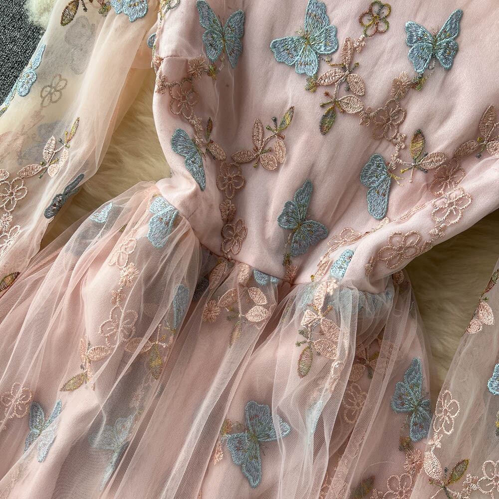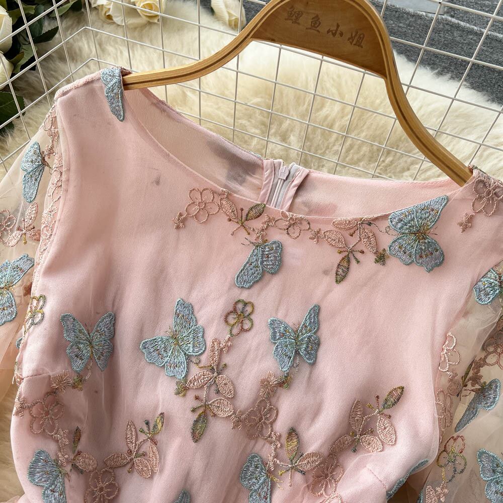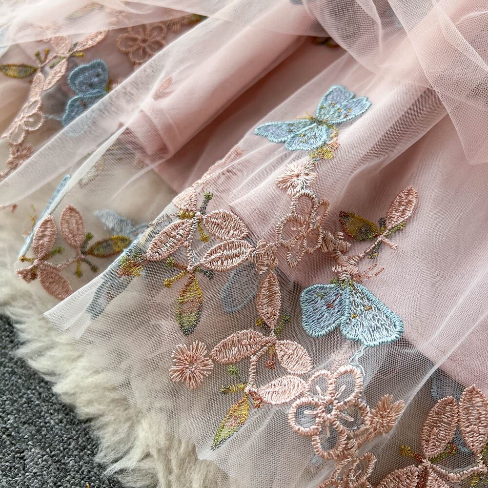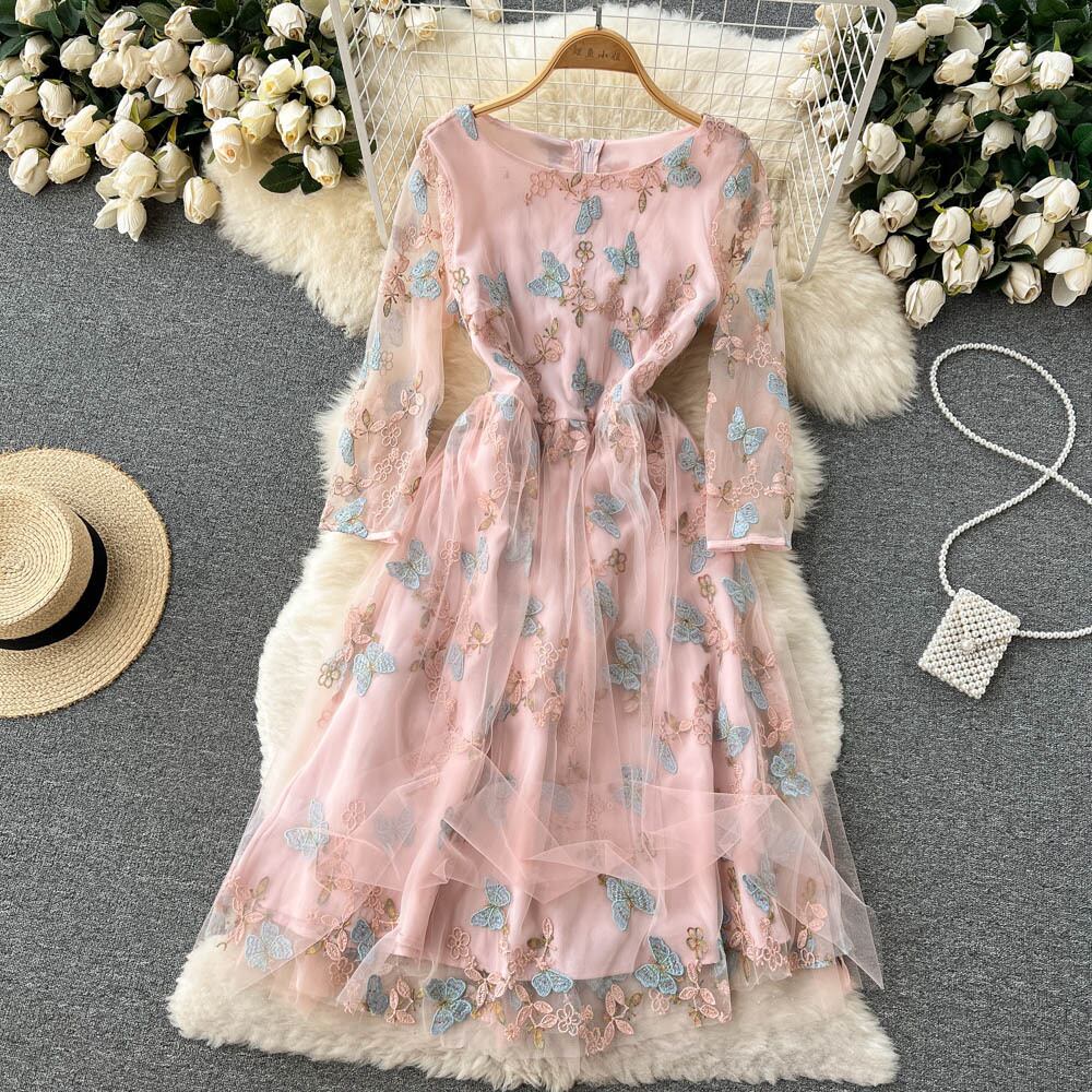 Mesh lace embroidered floral chiffon dress female waist slim holiday style long-sleeved sweet fairy skirt trendy ロング レッド シフォン レース 刺繍 大人ガーリー スウィート キュート カジュアル メッシュ 花柄 スカート スリム lyxaj10804059809
