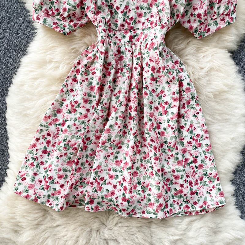 Small dress 2021 new summer dress female temperament V-neck slim short section age-reducing puff sleeve floral skirt ショート サマー 夏物 花柄 スカート Vネック スリム lyxaj80932321062