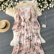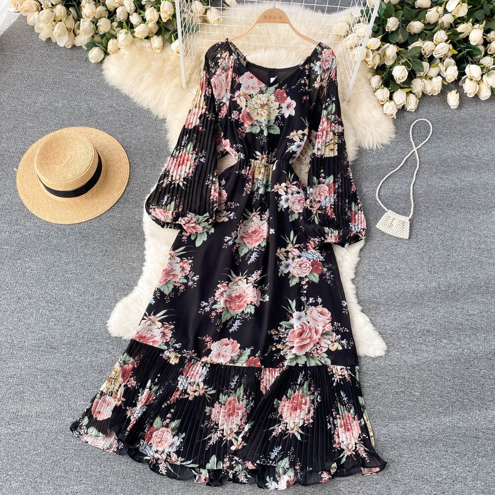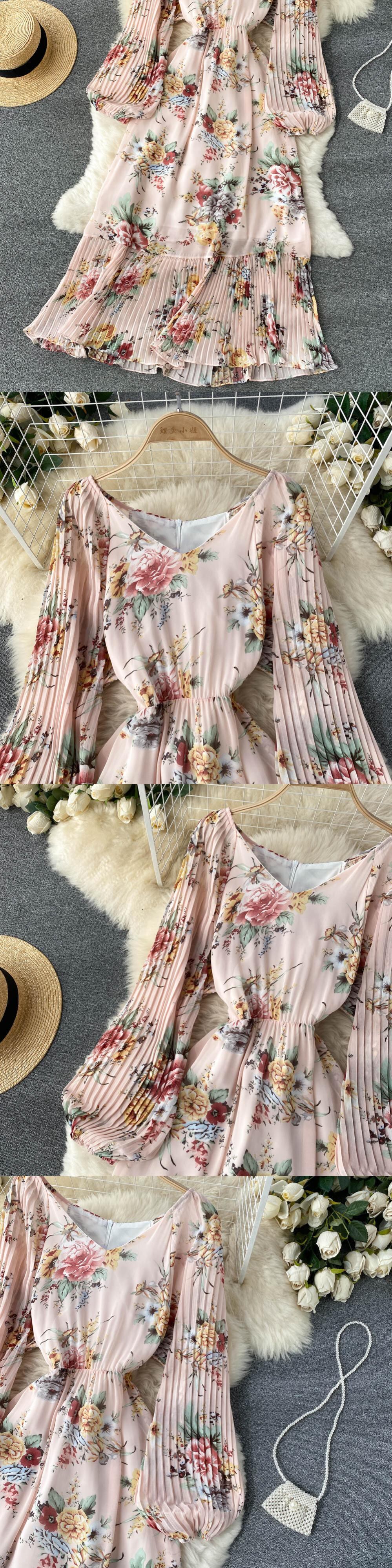 Sweet and gentle wind French floral dress female waist is thin temperament V-neck super fairy pleated large swing chiffon skirt シフォン 大人ガーリー スウィート キュート カジュアル プリーツ 花柄 スカート Vネック lyxaj68581534505
