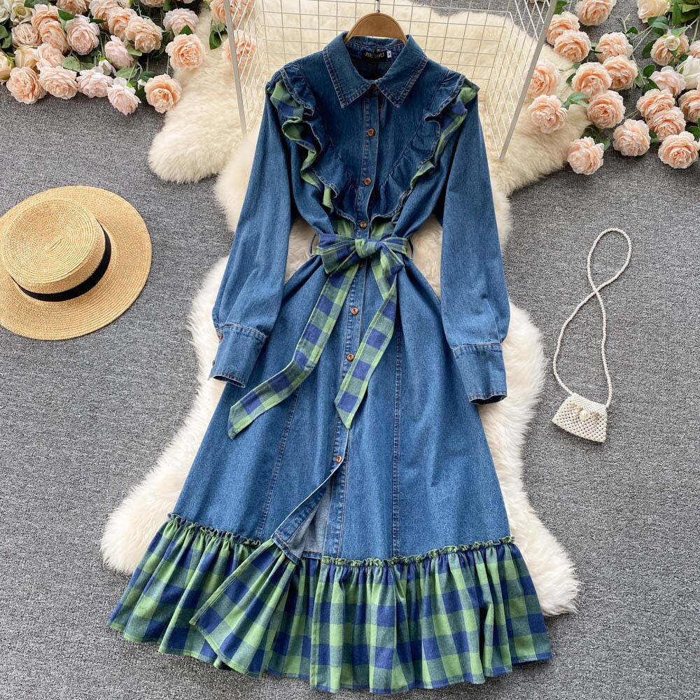 Retro Hong Kong-style lapel long-sleeved plaid stitching denim dress lace-up waist ruffled single-breasted midi skirt ロング レトロ レース スカート レースアップ ステッチ lyxaj45514347924