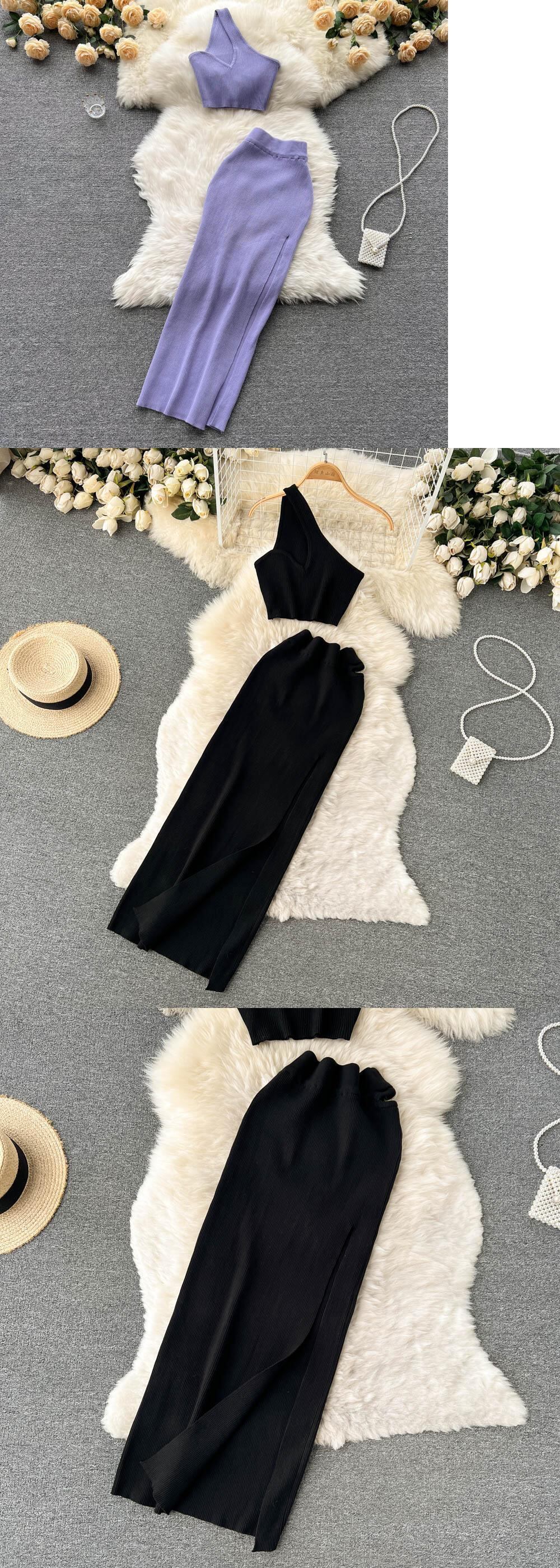 French retro Hepburn style sexy knitted suit one-shoulder suspender top women's high waist slit skirt two-piece set ハイウェスト レトロ スカート lyxaj55590345429