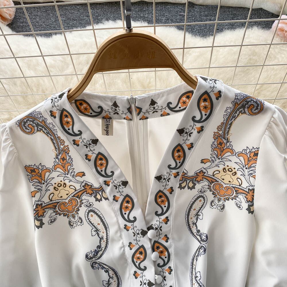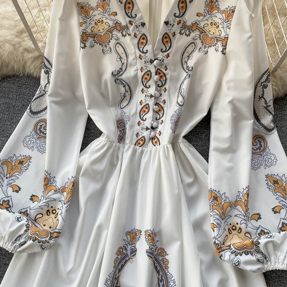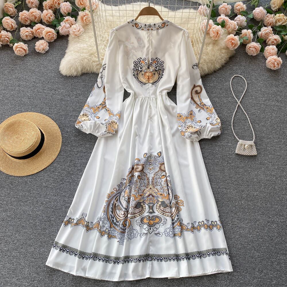 Spring and autumn ethnic style V-neck temperament puff sleeves waist thin printed dress elegant temperament large swing long skirt ロング プリント エレガント スプリング 春物 オータム 秋物 スカート Vネック lyxaj52094066934