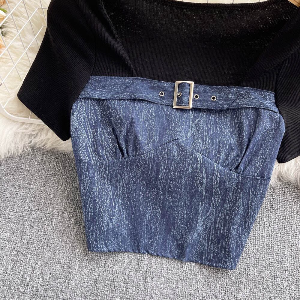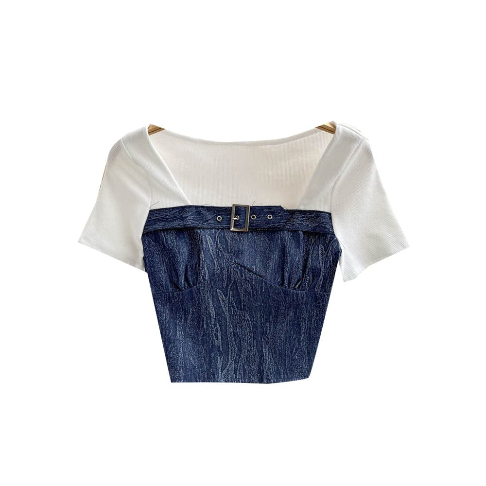 Summer self-cultivation small shirt pure desire wind niche t-shirt fake two-piece square collar collarbone bottoming shirt short-sleeved short top women ショート サマー 夏物 Tシャツ ピュア スクウェア lyxaj30402212370