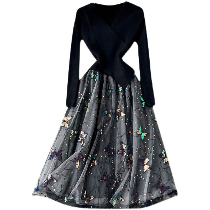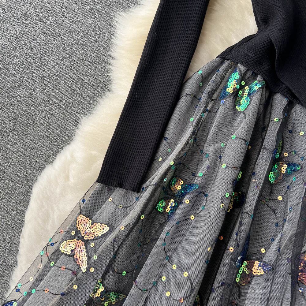 French dress women's 2021 new slim temperament long-sleeved knitted stitching floral embroidery mesh skirt trendy ロング 刺繍 メッシュ 花柄 スカート スリム ステッチ lyxaj6723788549